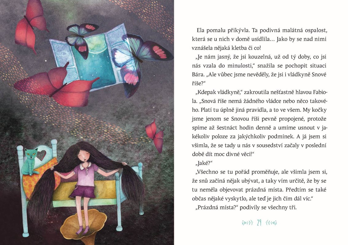 Kouzelná kočka Fabiola tentokrát nepřenese Sesterstvo do minulosti, ale do říše snů! Začínají se tam totiž dít moc divné věci. V Elině ulici navíc nikdo nemůže v klidu spát, všichni se pořád bezdůvodně budí a ráno jsou pak strašně mrzutí. Že by to spolu nějak souviselo? Ela s Bárou a Míšou se v doprovodu neobyčejné kočky s tím nejhebčím kožíškem pouštějí do pátrání. O tajemno a dobrodružství při tom rozhodně nebude nouze!