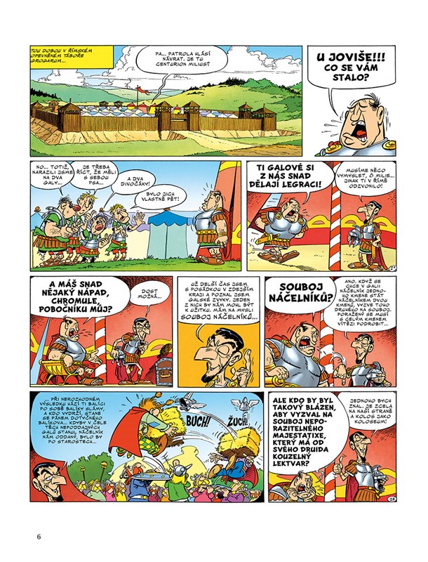 Římané přijdou s novým rafinovaným plánem, jak si podrobit vesničku neporazitelných Galů. Podle galské tradice může jeden náčelník vyzvat jiného na souboj a vítěz se pak stává náčelníkem obou kmenů. Loajálního a Římu oddaného galského náčelníka najdou velmi rychle, teď už jenom musí zařídit, aby se Majestatix před soubojem nemohl napít čarovného nápoje. No a tady se řešení opět nabízí samo: je potřeba zbavit se druida!
