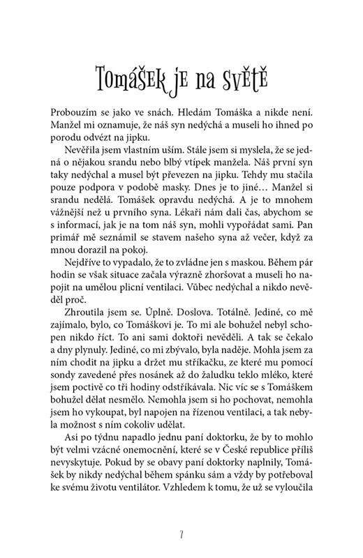 Autentický příběh, který napsal sám život. Kniha vypráví o malém chlapci jménem Tomášek, který i přesto, že se narodil s velmi vzácným onemocněním – když usne, přestane dýchat a musí být napojen na umělou plicní ventilaci – neztrácí radost ze života.