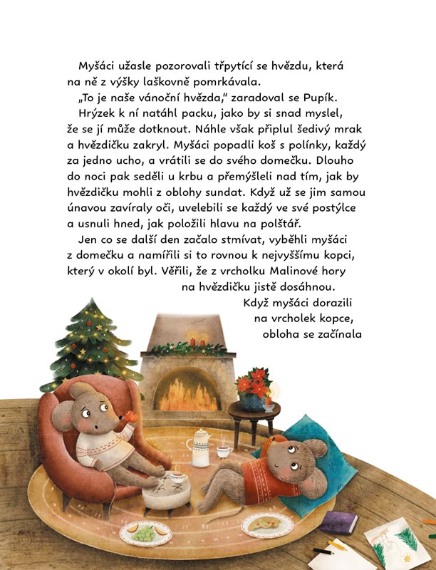 Myšáci Pupík a Hrýzek se nemohou dočkat Vánoc. Chaloupku mají uklizenou a vyzdobenou, stačí už jen posadit na špičku stromečku vánoční hvězdu. Když jejich okno rozrazí rozpustilý vítr, hvězdičku shodí na zem a ta se rozbije, mají po radosti. Co teď? Nešla by nahradit skutečnou hvězdou z oblohy, která zvědavě nakukuje do jejich domečku?