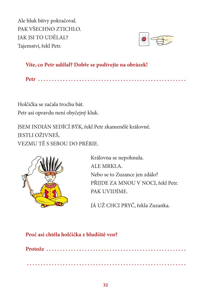 Kniha na pomoc malým školákům. Dítě prochází pohádkově-fantastickým příběhem Petra a Zuzanky, kteří si umějí báječně vymýšlet. Občas ale potřebují pomoci. A tehdy je na dítěti, které s knížkou pod vedením rodičů pracuje, aby rozhodlo, jak bude příběh pokračovat, zvolilo správnou variantu řešení či jen uplatnilo vlastní názor na vzniklou situaci. Dítě čte text, vytištěný velkými písmeny, rodiče věty doplňují. Postupem času, jak se nácvik čtení prohlubuje, přibývá částí určených dětem.Po každém krátkém (dějově uzavřeném) odstavci