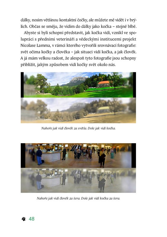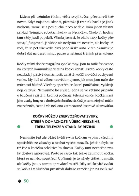 Najdete v ní mnoho rad, jak vyladit k dokonalosti vzájemné soužití. Autorka mimo jiné vysvětluje, co jsou konejšivé signály, čím se liší kočičí smysly v porovnání s lidskými, jaké jídlo kočkám prospívá a naopak škodí nebo na co si dát pozor při udržování čisté společné domácnosti. Poslední kapitoly jsou věnované aromaterapii a také trochu věcem mezi nebem a zemí. Je kočka skutečně magická bytost, která dokáže uzdravovat? Kniha je doplněna mnoha barevnými fotografiemi ze života těchto malých svérázných šelem.