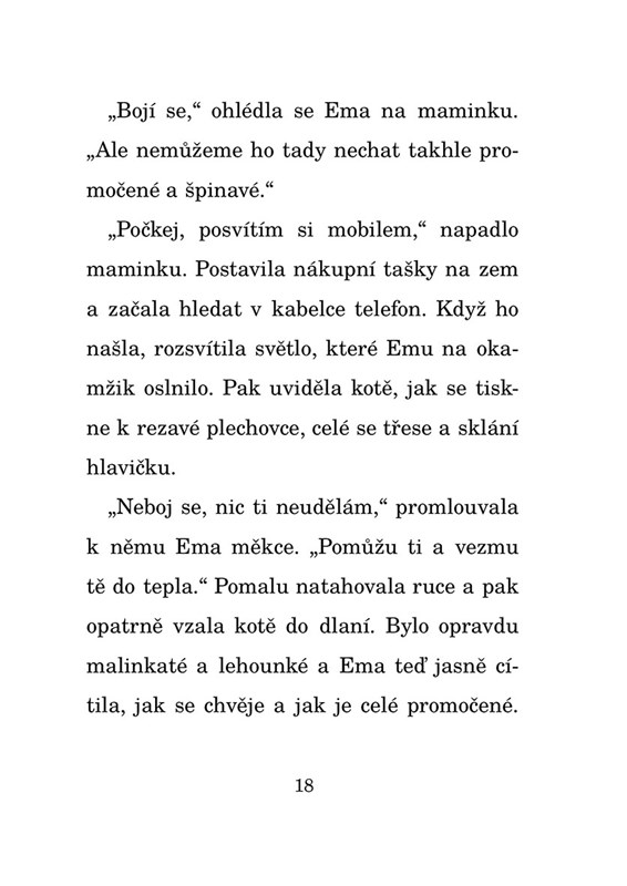 Když jednoho dne před Vánoci vyrazí Ema s maminkou na nákupy, zaslechnou z nedaleké uličky tiché mňoukání. Mezi odpadky pak objeví malé opuštěné kotě, které se třese zimou. Místní útulek je přes vánoční svátky zavřený, a tak nezbývá nic jiného než vzít koťátko domů.