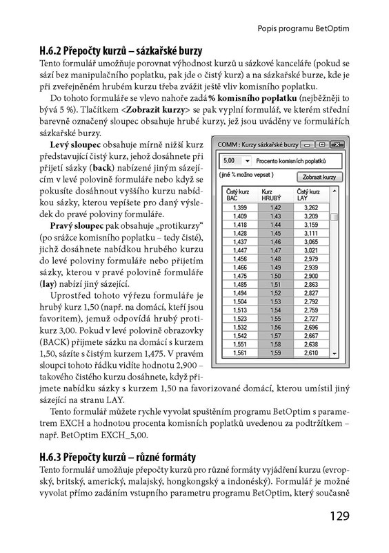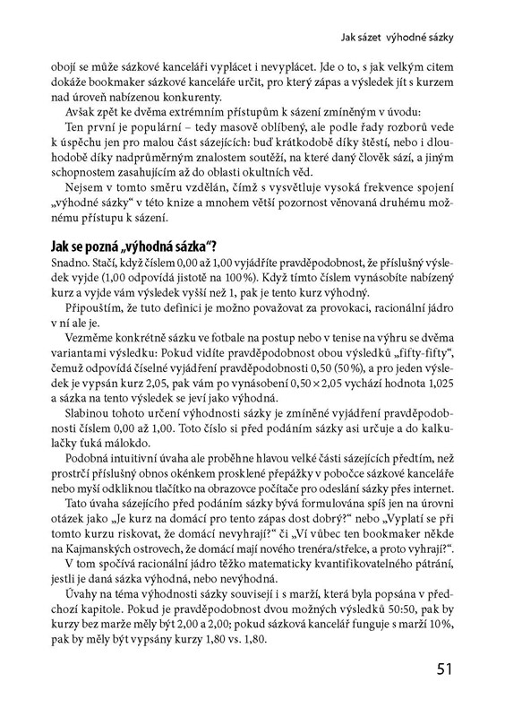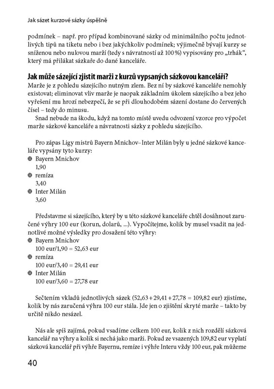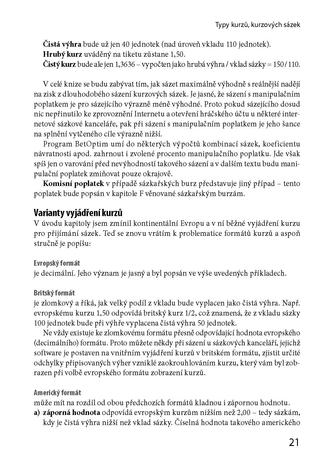 Autor, který zná kurzové sázení jak z pozice sázkaře, tak z pozice bookmakera, předkládá čtenářům své kompletní know how. V knize naleznete popis sázkařských strategií včetně potřebné finanční matematiky, návody jak zvýšit výtěžnost vlastních vkladů sázek, jak využívat sázkařských burz typu Betfair, layování a backování sázek a mnoho dalších cenných informací. Čtenář knihy si navíc může zdarma instalovat užitečný sázkařský program BetOptim.
