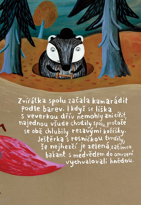 Když do lesa Habřince jednoho dne přiletí z města papoušek, je z toho velké pozdvižení. Všechna zvířátka najednou obdivují jeho krásně pestrobarevné peří, zatímco ten, kdo má jen černobílý kožíšek, upadá v přezíravé přehlížení. Například jezevec Chrujda. Pak ale do lesa přijedou tři černobílí filmaři – panda, zebra a straka – natáčet černobílý film. A kdo v něm získá hlavní roli? No přece náš jezevec… Příběh malé čtenáře hravou formou vede k poznání, že to podstatné u lidí, stejně jako u zvířátek, nemají hledat na povrchu, ale v nitru. A že móda se rychle mění, kdežto opravdové přátelství zůstává stále.