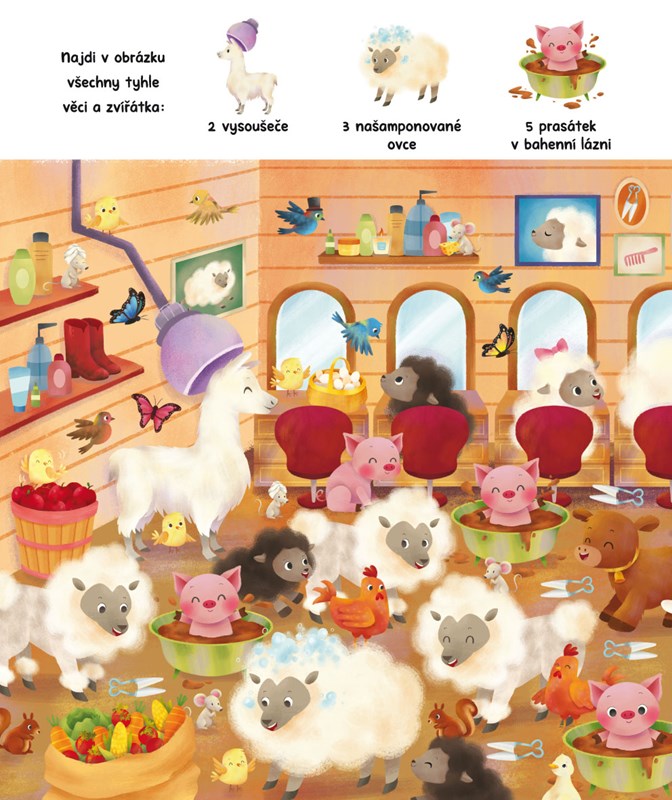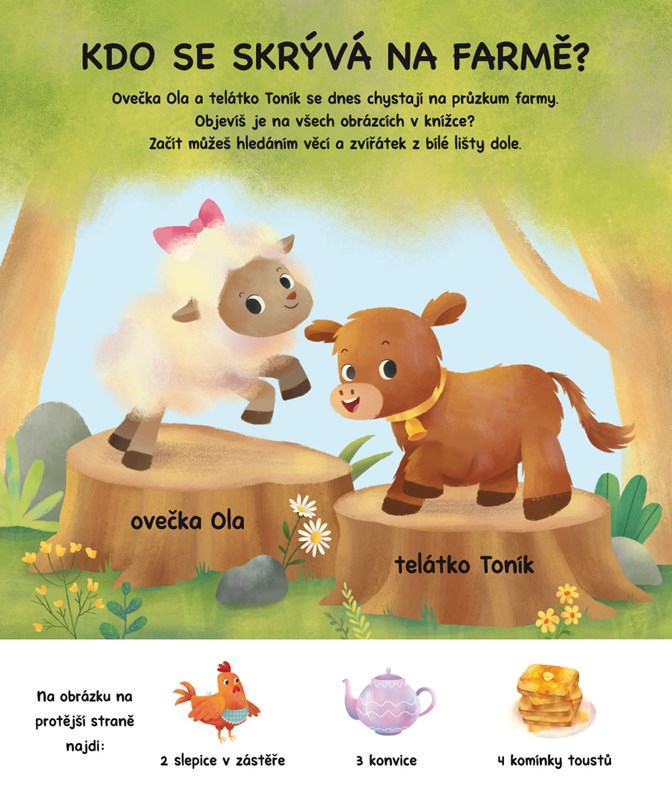 Ovečka Ola a telátko Toník se rozhodnou prozkoumat farmu, na které žijí. Co všechno na ní objeví? Malí čtenáři se s nimi podívají na pole, zahrají si na schovávanou v kukuřičném bludišti, vykoupou se s kachnami v rybníčku, zúčastní se s prasátky výtvarného dne nebo si uspořádají báječnou oslavu sklizně. Tipy k hledání věcí i zvířátek na každé dvojstraně pomohou dětem procvičit postřeh a základní počty, ale kromě nich na ně čeká ještě poslední stránka s prémiovými úkoly, která prověří paměť a zaručí, že knížka Farma nebude jen na jedno přečtení.