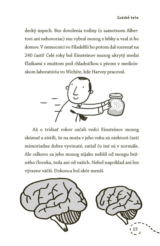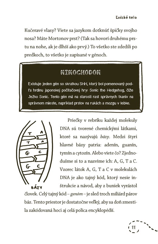 Vďaka tejto knihe budeš odborníkom na ľudské telo a svojich kamarátov a učiteľov môžeš ohromovať pozoruhodnými faktami z anatómie. Vieš, že vlasy sú rovnako silné ako medené vlákno? Alebo že pľúca sa denne nadýchnu a vydýchnu asi 20 000-krát a že keby si vedel rozprestrieť celý povrch tenkého čreva aj s klkmi, pokryl by plochu tenisového kurtu?
