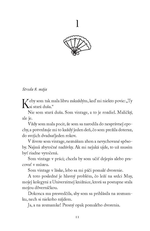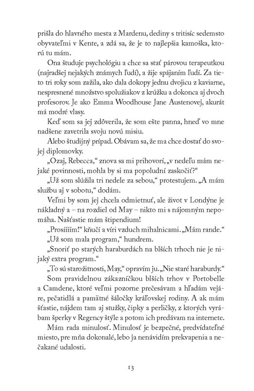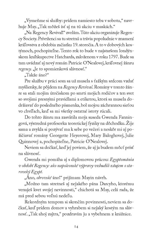 Kto by nechcel žiť na začiatku 19. storočia v Londýne uprostred plesov, večierkov a pozvaní na kráľovský dvor? Rebecce Sheridanovej by sa to určite páčilo, 21. storočie je pre ňu stiesňujúce: rýchly život, nulový osobný priestor a muži… Naozaj už nikto nevie, ako dvoriť dievčaťu? Študentka egyptológie a vášnivá čitateľka regentských romancí Rebecca rada navštevuje historické rekonštrukcie v kostýmoch. Počas jednej z nich sa stane niečo nevysvetliteľné: ocitne sa v Londýne roku 1816. Po prekonaní prvotného šoku si uvedomí, že má jedinečnú príležitosť stať sa najžiadanejšou debutantkou medzi slobodnými mužmi z vyššej spoločnosti, uprostred čajových večierkov, plesov a prechádzok v Hyde Parku. Rebecca však upúta pozornosť toho najmenej vhodného muža v Londýne: Reedlana Knoxa, šviháka s temnou minulosťou a škandalóznou povesťou piráta. Skrátka muža, s ktorým by sa slušná mladá dáma naozaj nemala stýkať. Čo ak sa nakoniec ukáže, že spoločenský vyvrheľ je zaujímavejší ako džentlmen, o ktorom vždy snívala? Rozhodovanie, či sa vrátiť do súčasnosti, alebo zostať v roku 1816, môže byť poriadne ťažké…