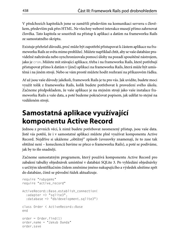 S trojicí zkušených autorů, mezi nimiž najdeme i tvůrce frameworku, se seznámíte s Ruby on Rails na vývoji komplexní webové aplikace. S každou přidanou funkcionalitou projektu se naučíte něco nového až po výslednou plně funkční aplikaci. Výklad postupuje od základů, nevyžaduje žádné předchozí znalosti s Ruby on Rails. V druhé polovině knihy se seznámíte s pokročilými postupy, jak využít možnosti frameworku na maximum.