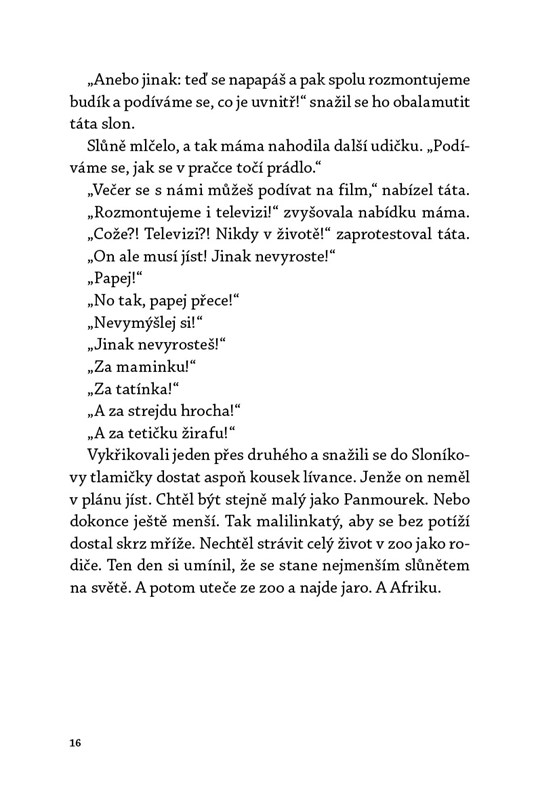 V zoo se narodí malý sloník. Od rodičů se dozví, že jejich skutečným domovem není výběh za mřížemi, ale daleká Afrika. A protože je malý jen tak napůl, vymyslí plán: přestane jíst, aby se zmenšil a protáhl se mřížemi ven do světa. Kdyby jen tušil, že na něj čekají nečekané překážky a nebezpečí. Dobrodružství ho zavede do školy i do cirkusu, potká nové přátele, ale i pochybné existence, kterým je radno se vyhýbat.