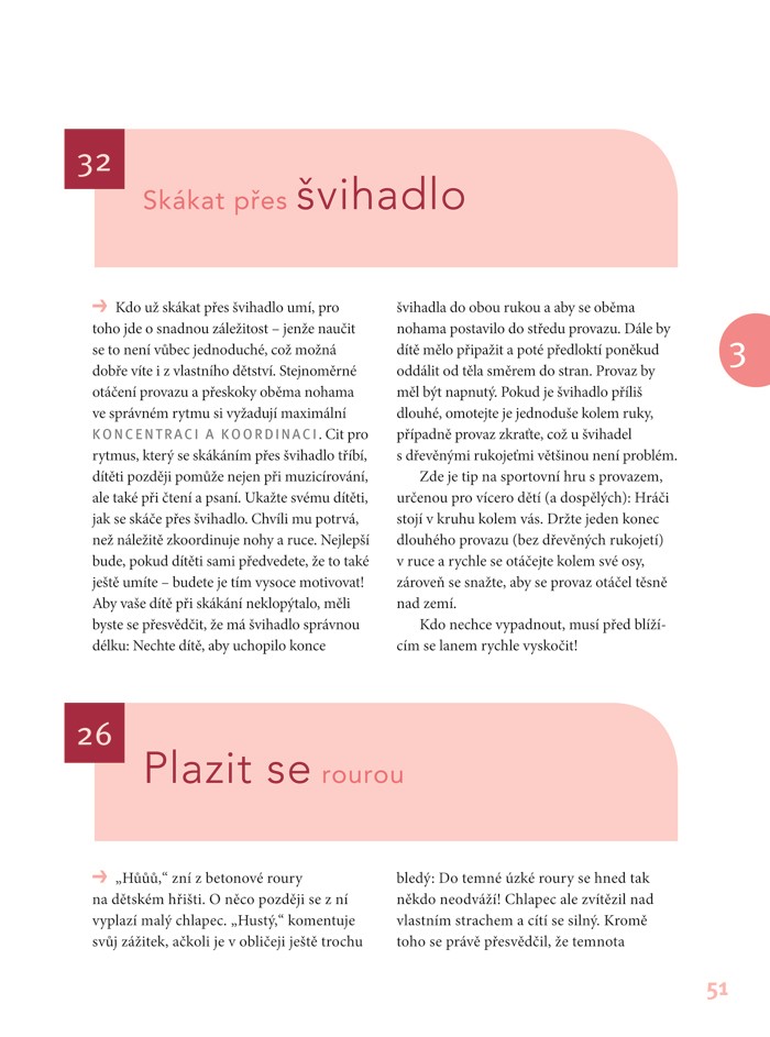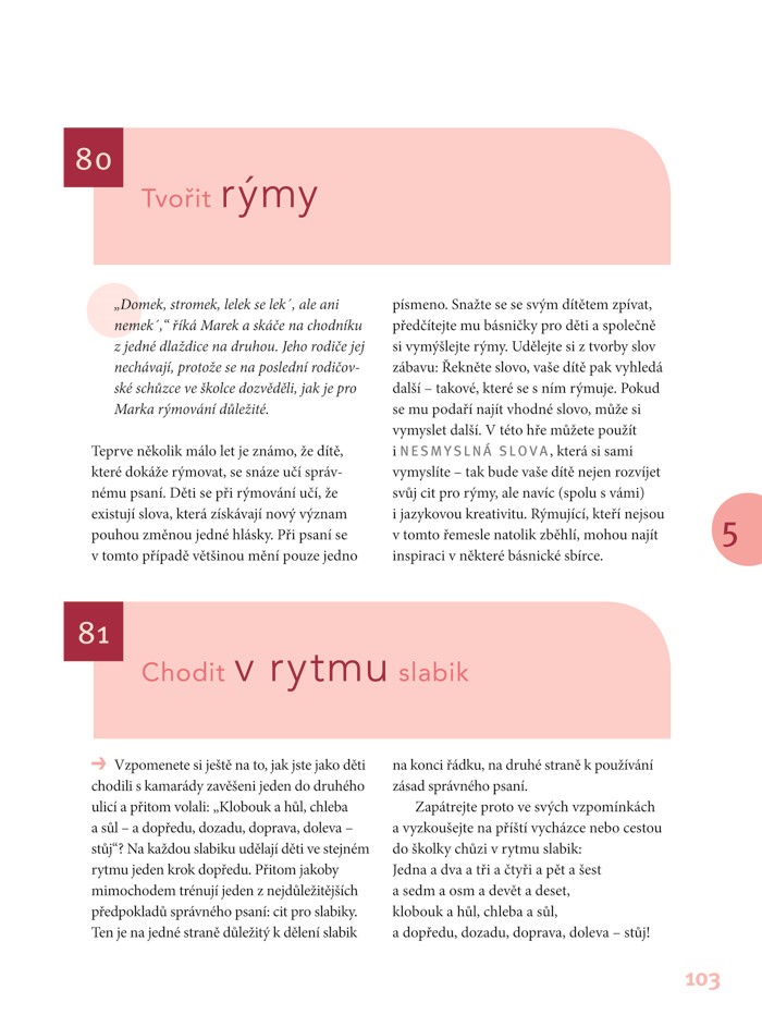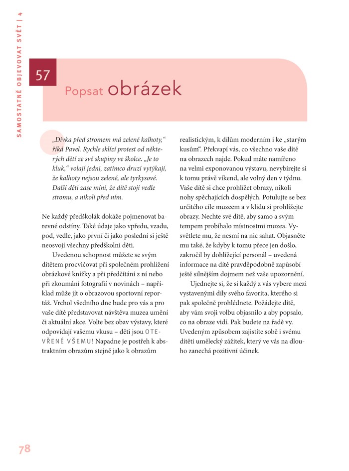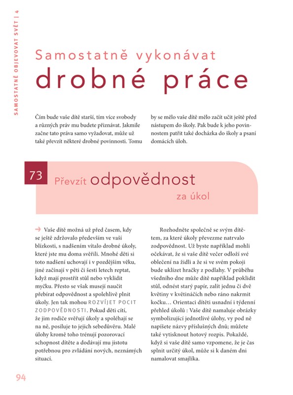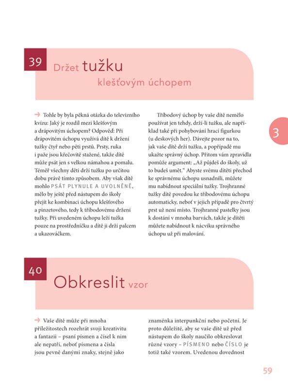 Budete se spolu učit nové a trénovat to, co vaše dítě již zvládá samo: pomáhání při drobných domácích pracích, hledání rozdílů v obrázcích, stavění z kostek, rozpoznávání množství, vyjádření vlastních přání, orientaci v okolí bydliště, jak pomoci druhému, pojmenování částí těla, rozpoznání pachů, popsání oblíbeného jídla, tleskání do rytmu, rýmování, říkání jazykolamu, kreslení postaviček a mnoho dalších činností...