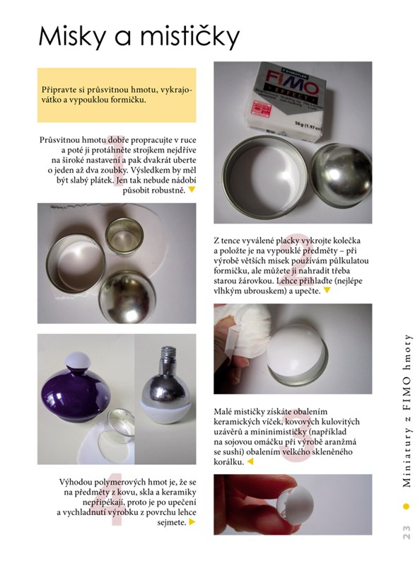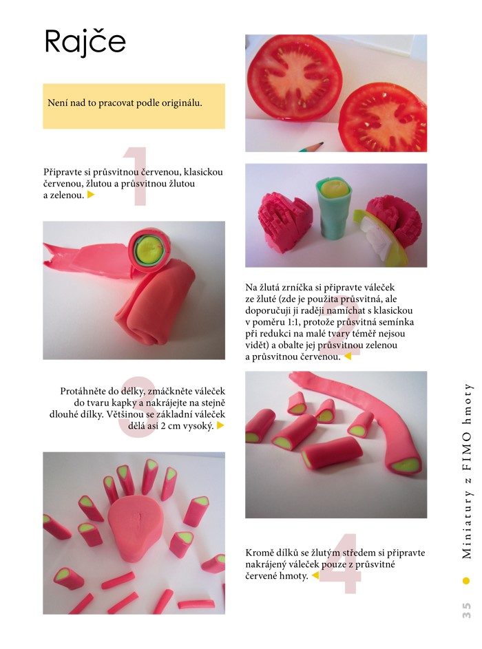 Chcete vyzkoušet novou dimenzi práce s FIMO hmotou? Vyrobit si miniaturní dobroty, které budou ozdobou vašich interiérů, originálním šperkem či doplňkem výbavičky pro panenky? Dortík, ovoce, zelenina, hamburger, zkrátka fantazii se meze nekladou. Zkušená autorka vám ve vybraných projektech ukáže jak na to, dozvíte se jaké pomůcky a materiály budete potřebovat, jak zvládnout míchání barev či povrchovou úpravu výrobků. Všechny postupy jsou doprovázeny mnoha fotografiemi, které vás povedou krok za krokem ke zdárnému cíli.