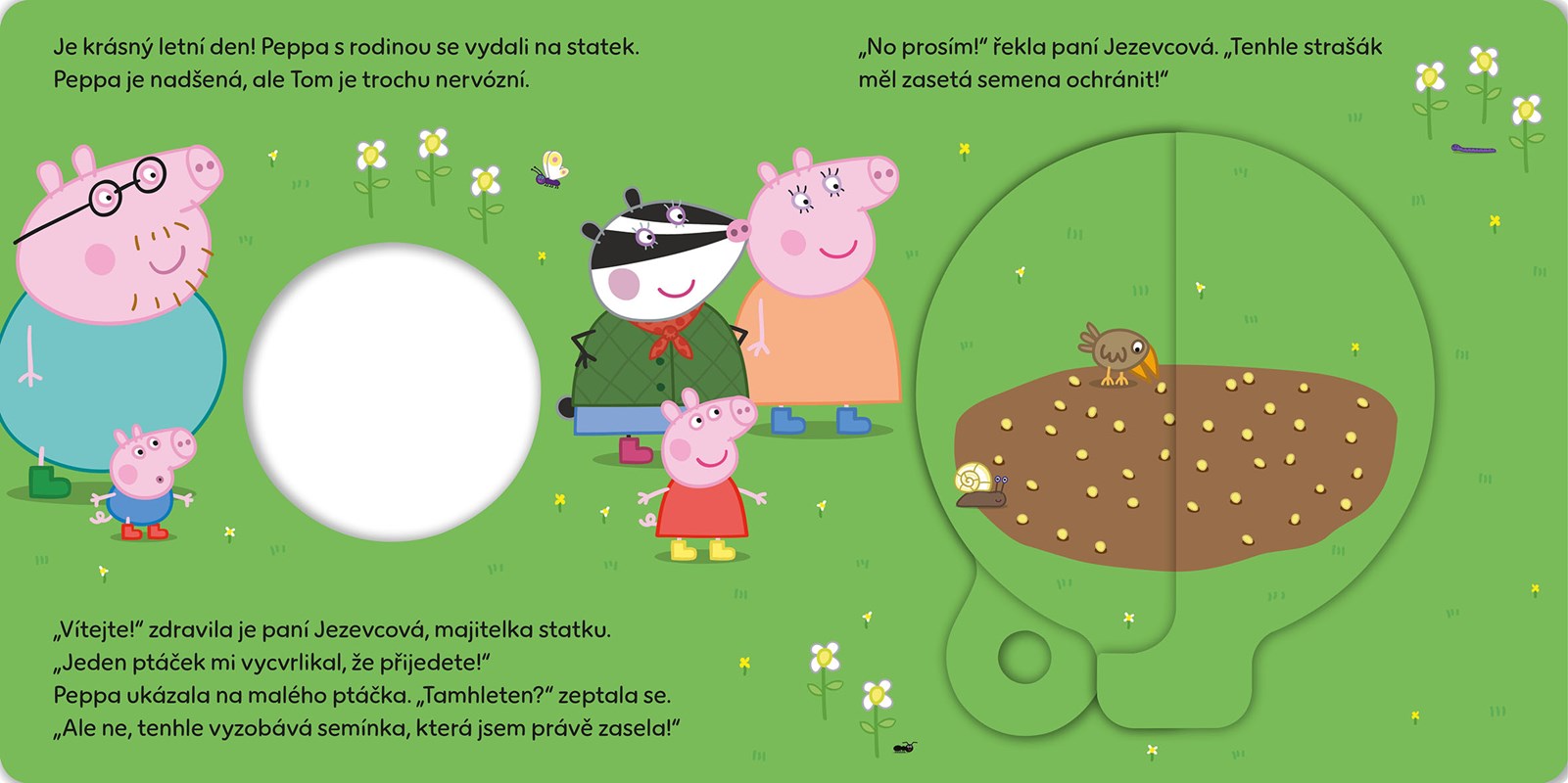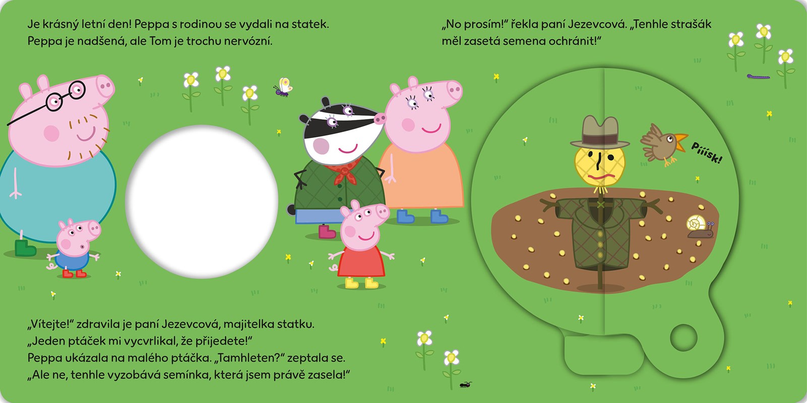 Peppa a Tom se vydali s rodiči na statek. Tom je trochu nesvůj… Naštěstí je tu ale jeho starší sestra Peppa, aby mu ukázala, jak ÚŽASNÉ je to místo. Přečtěte si příběh, otáčejte kouzelným kolečkem a užijte si zábavu na statku!