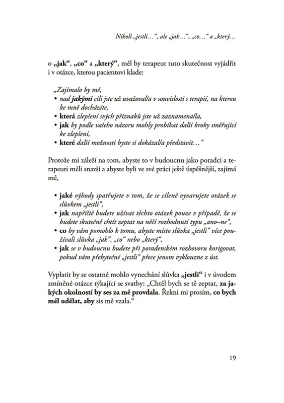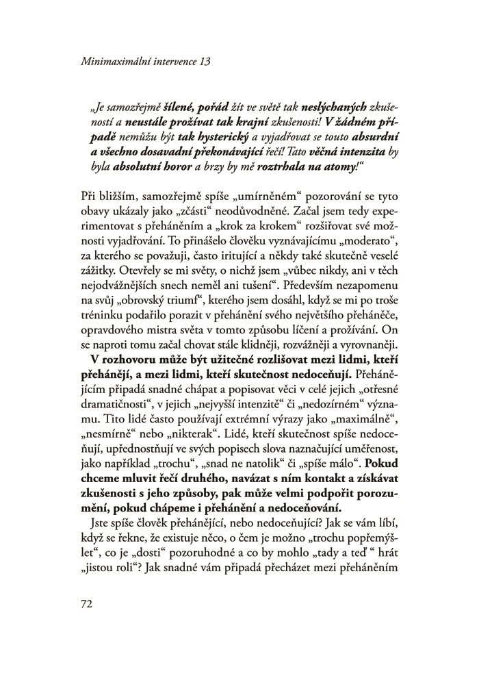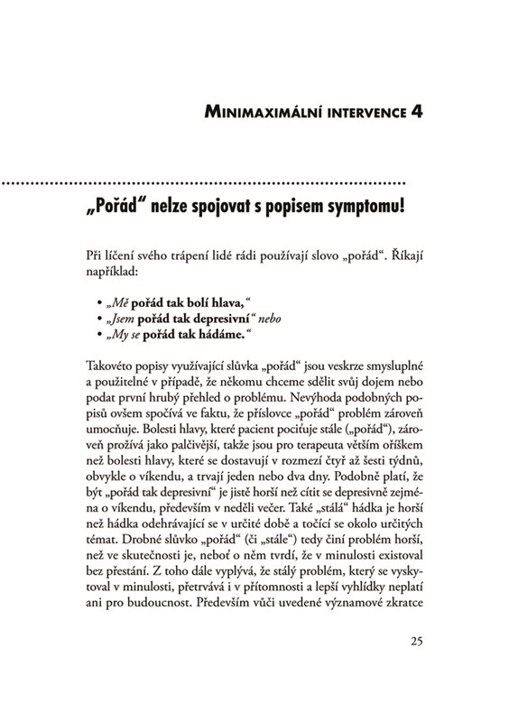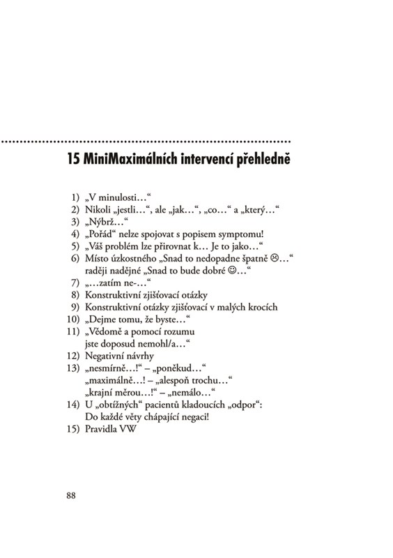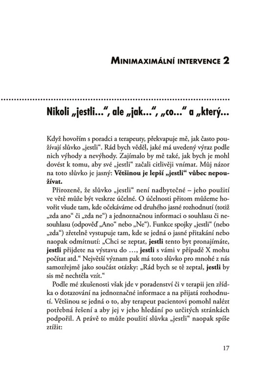 MiniMaximální intervence. Ucelené, krásné, jednoduché. Až se stanou samozřejmou součástí repertoáru poradců a terapeutů, nebudou často ani oni ani jejich klienti po vzájemných rozhovorech vědět, čím se nenápadně daly do pohybu blahodárné změny a řešení – a právě tím se