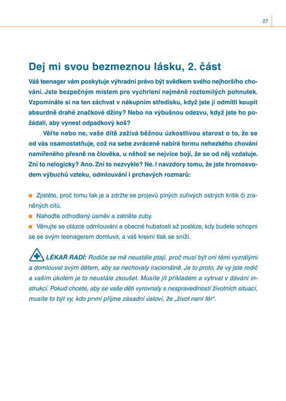 Naštěstí je zde tento manuál, který odpoví na vaše nejnaléhavější otázky: Jak mohu svého potomka naučit dělat chytrá rozhodnutí? Co a jakým způsobem je potřeba probrat s dospívající dívkou a co s chlapcem? Jak dosáhnu toho, aby se mnou mé pubertální dítě komunikovalo, aby se učilo, uklízelo si v pokoji, nepropadlo drogám, kouření, alkoholu... ?