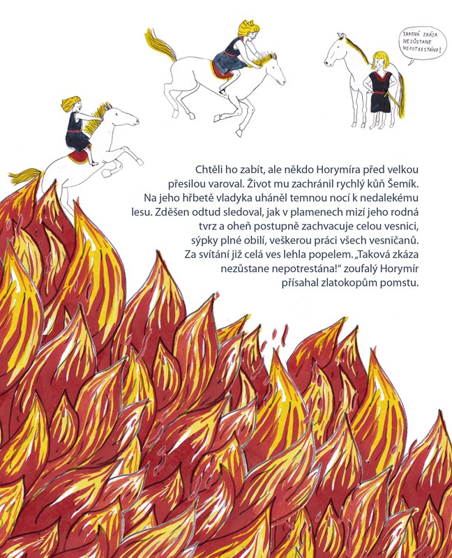Za knížete Křesomysla rostly v Čechách jako houby po dešti doly na zlato a stříbro. Lidé omámeni mamonem přestali obdělávat pole a hrozil hladomor. Zastavit zlatou horečku se pokusil vladyka Horymír, za což si vysloužil trest smrti v žaláři na Vyšehradě. Jak se odtud spolu se svým koněm Šemíkem zázračně zachránil, vypráví další svazek edice Pražské legendy. Příběh z pera Ivy Pecháčkové bohatě ilustrovala úspěšná autorka komiksů Klára Břicháčková.