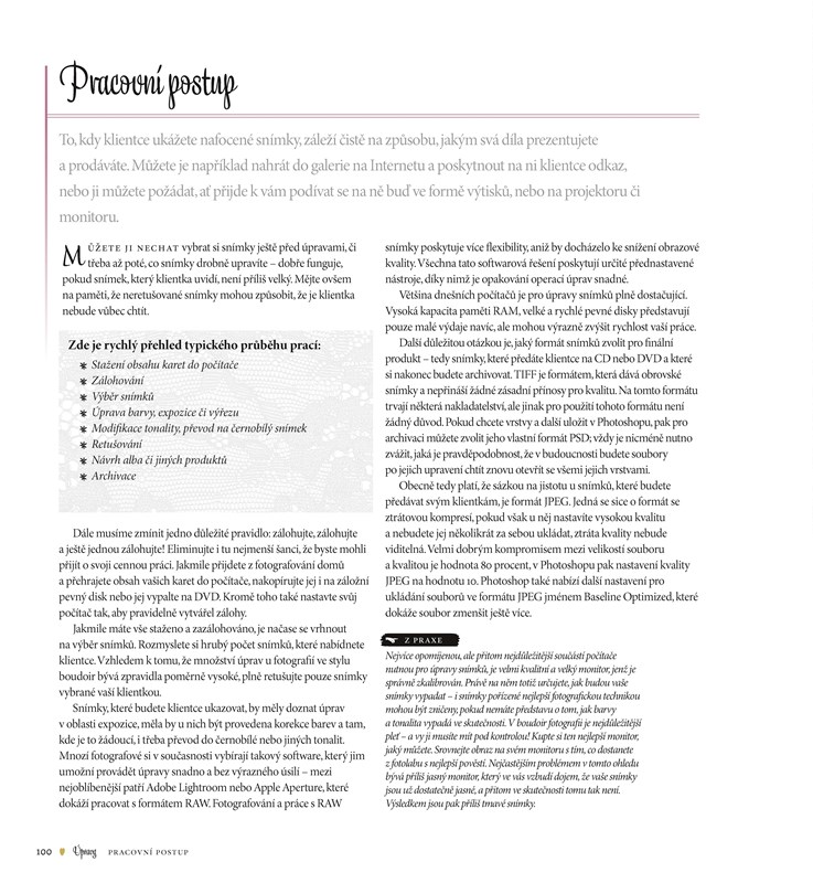 Zkušená fotografka vás detailně provede celým průběhem fotografování od nezbytné přípravy s klientkou přes volbu šatníku a líčení nebo vhodné pózy až po nezbytné techniky postprodukce. Kniha vám pomůže pracovat jako profesionálové, ale natolik důvěrně, aby výsledkem byly technicky dokonalé, krásné a jedinečné snímky.