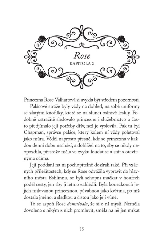 Princezna Rose Valhartová zase ví, že s mocí přichází i zodpovědnost. Má se přivdat do chladného, nelítostného království a ona rozhodně nezahodí svoje královské povinnosti jen proto, že se probudila uprostřed pouště ve společnosti pohledného únosce. Ale život mimo palácové zdi je daleko dobrodružnější a krásnější, než si kdy představovala, a čarodějnice, kterých se dlouho bála, možná budou nakonec rodinou, již celý život nevědomky postrádala. Dvě sestry, které byly rozděleny při narození a vychovávány v naprosto odlišných světech, se teď poznají daleko víc, než by se dalo čekat. Ale zatímco se blíží korunovace a ony obě touží uplatnit svá rodová práva, hrozivý Willem Rathborne pracuje na tom, aby ani jedna z nich neuspěla. Komu nakonec na hlavě spočine koruna?