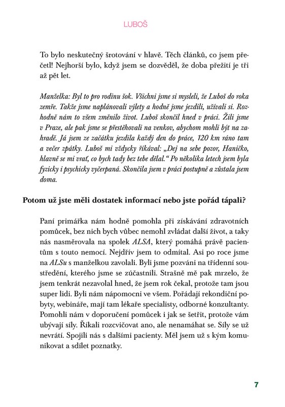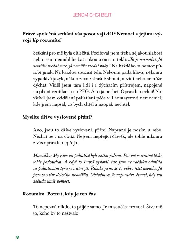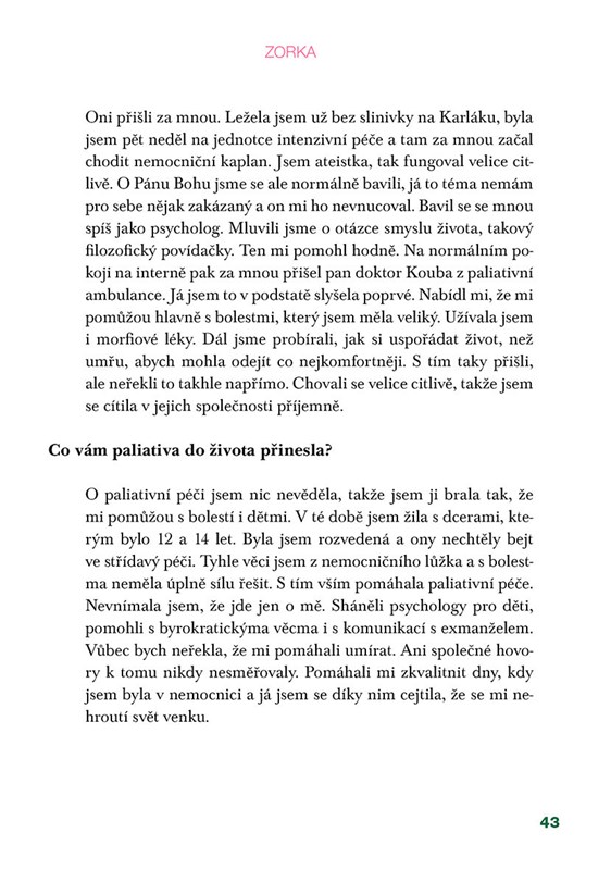 Co zůstane, když se život ztiší a všechno nepodstatné odpluje? Reportérka a dokumentaristka Lea Surovcová naslouchá lidem, kteří se ocitli v náročné a pro některé závěrečné etapě. V jejich vyprávění se zrcadlí radost, láska, lítost, hrdost a mnoho dalších emocí. Deset rozhovorů tvoří mozaiku života, který se pomalu uzavírá, ale přesto zůstává plný světla. Součástí publikace jsou i jemné ilustrace Lucie Charvátové.