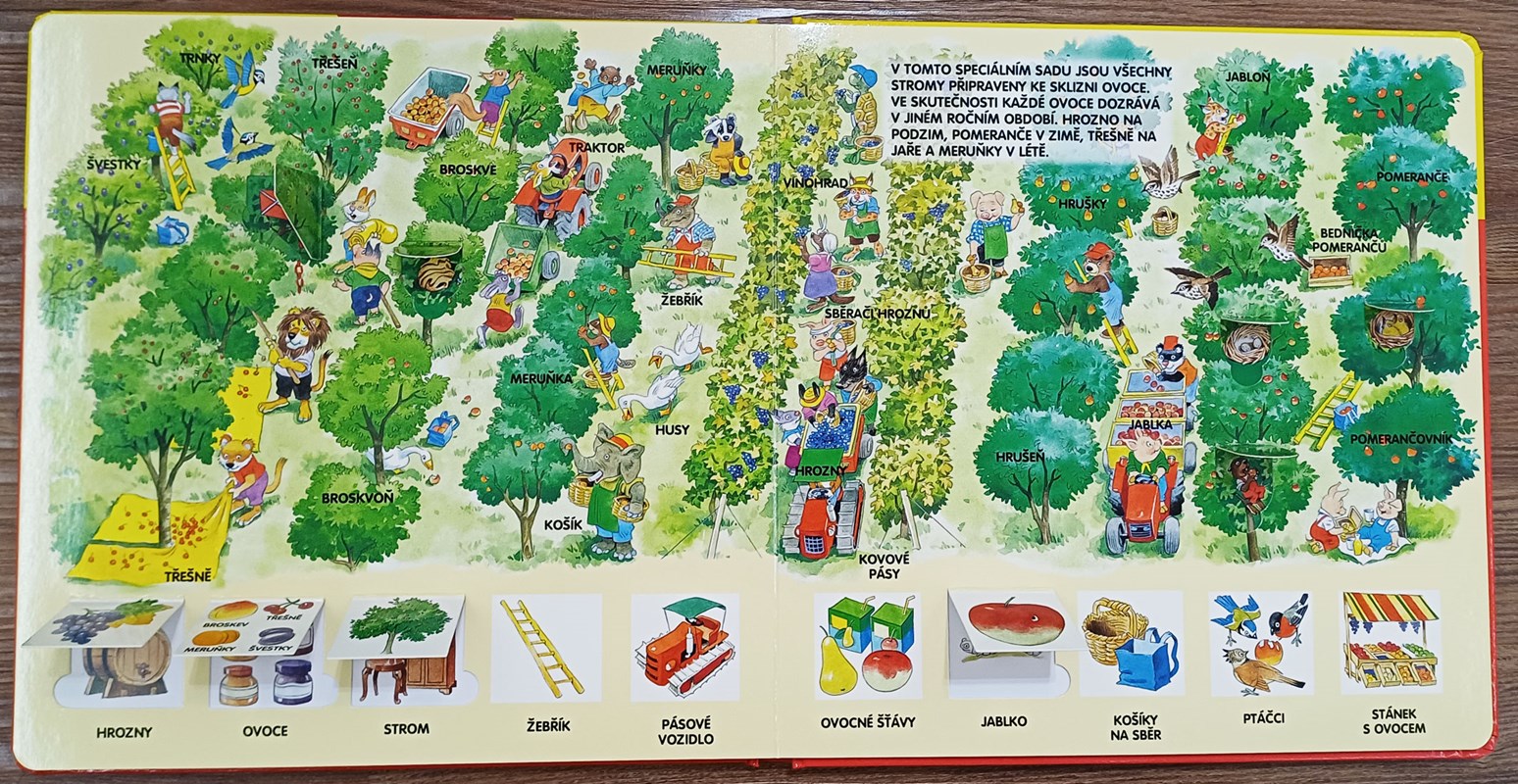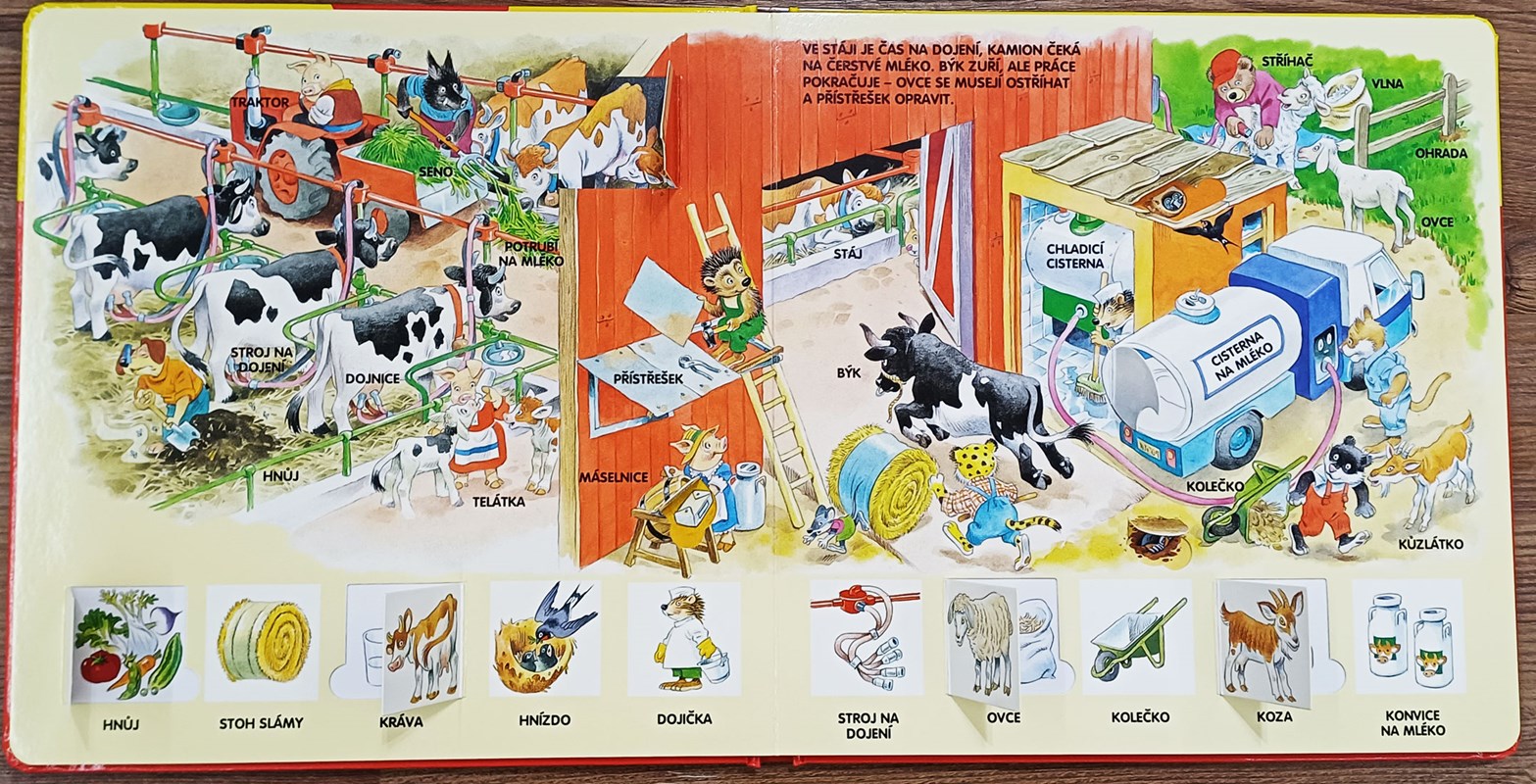 Kdo spí ve chlévě? Jak transportovat koníky? Odkud pochází med? Kde je schované zrno? Kdo podkouvá koníky? Jak se dělá máslo? Pootevírejte okénka a objevujte svět milých obyvatel farmy: těch, kteří dojí kravičky, vozí se na hříbětkách, sejí pšenici a ty, kteří sbírají ovoce. Všichni usilovně pracují, přičemž zažívají různé vtipné příhody.