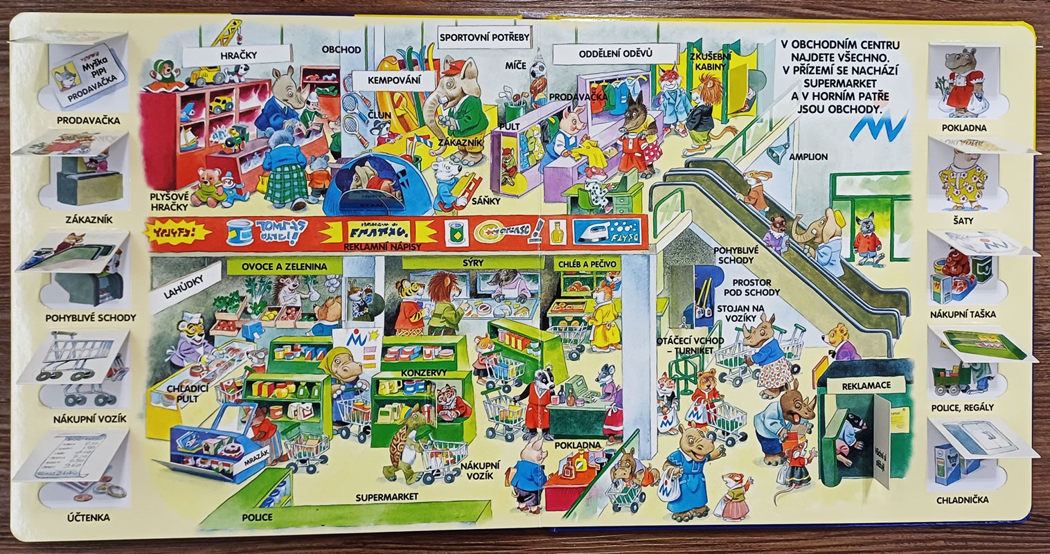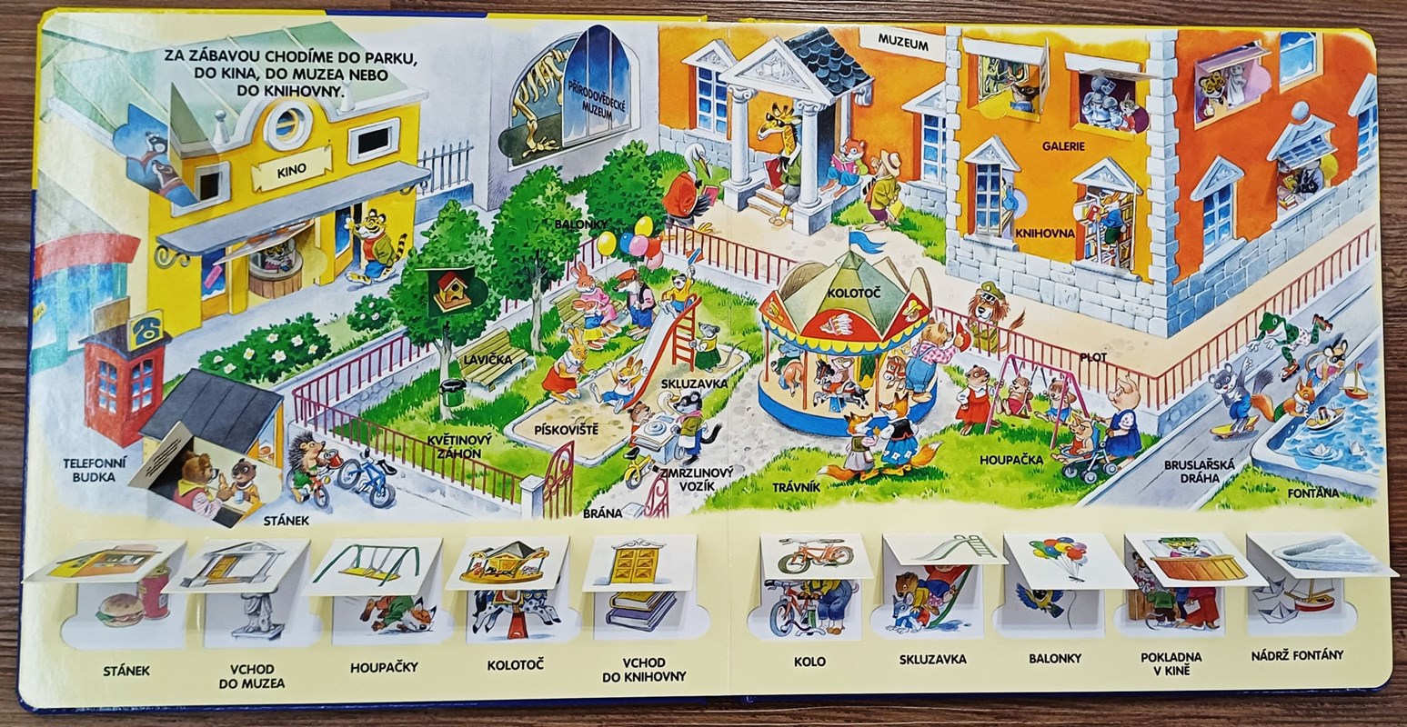 Projděme se spolu po ulicích a náměstích města, objevujme jeho veselé obyvatele a jejich řemesla. Otevřete více než 100 okének a naučte se vše, co se děje na ulici, na nádraží, v továrně, na letišti, ve velkých hotelech a v supermarketu. Všichni pracují ve městě a někomu se občas stane i něco zábavného!