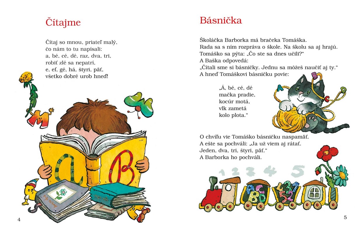 V tejto jedinečnej knižke nájdete pestré príbehy, verše, riekanky, bájky, vtipy a hádanky začínajúcich čitateľov, ktorí si naviac chcú vyskúšať i svoje herecké umenie v divadelných scénkach. Sú tu tiež rady a príklady ako písať listy. Pestré prvé čítanie, ktoré je obľúbenou knižkou v školách.