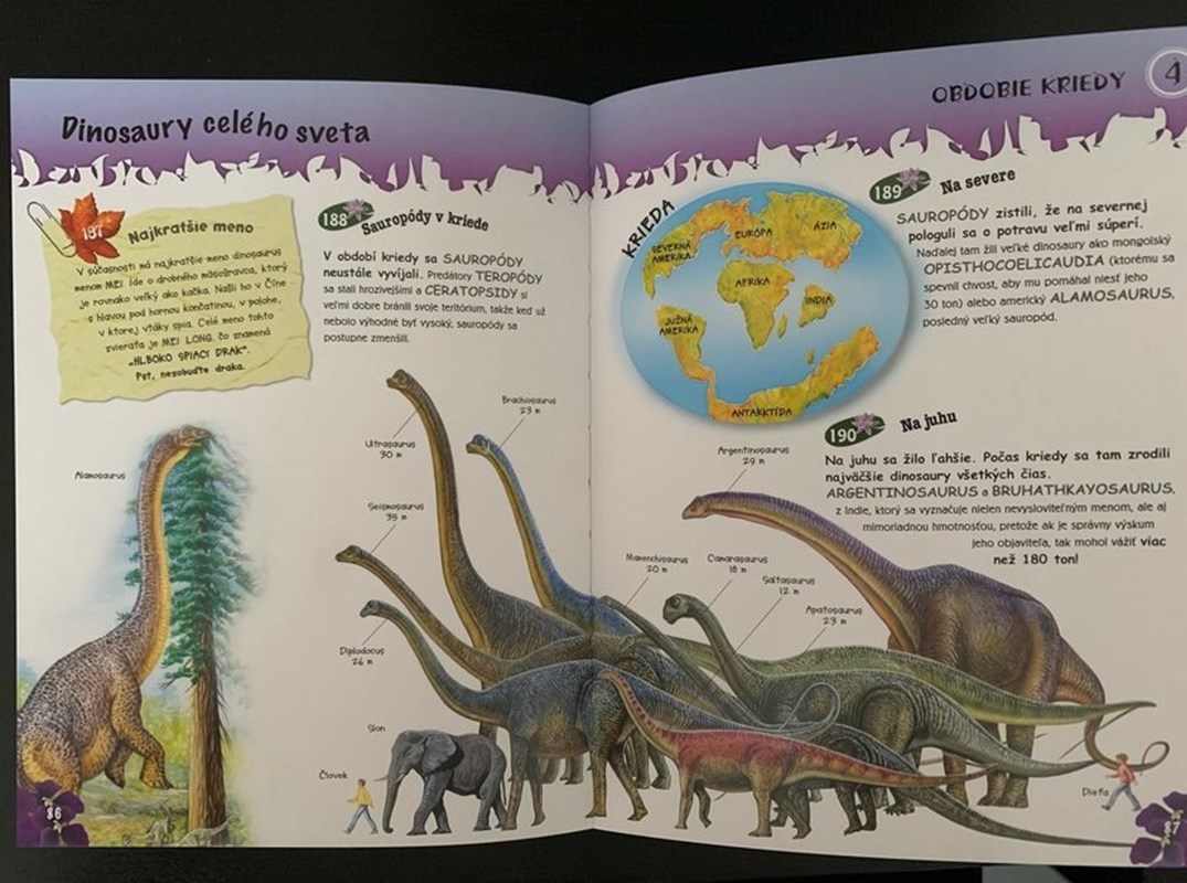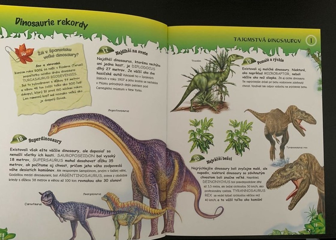 Vedel si, že brachiosaurus mal veľmi silné srdce? Alebo že stopy tyrannosaura pripomínajú ozrutného kanárika? Toto a ešte omnoho viac zaujímavostí ťa čaká v tejto zábavnej knižke.