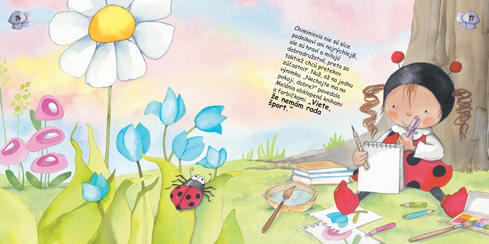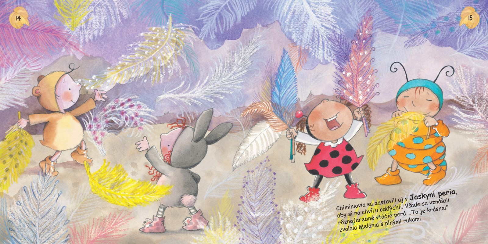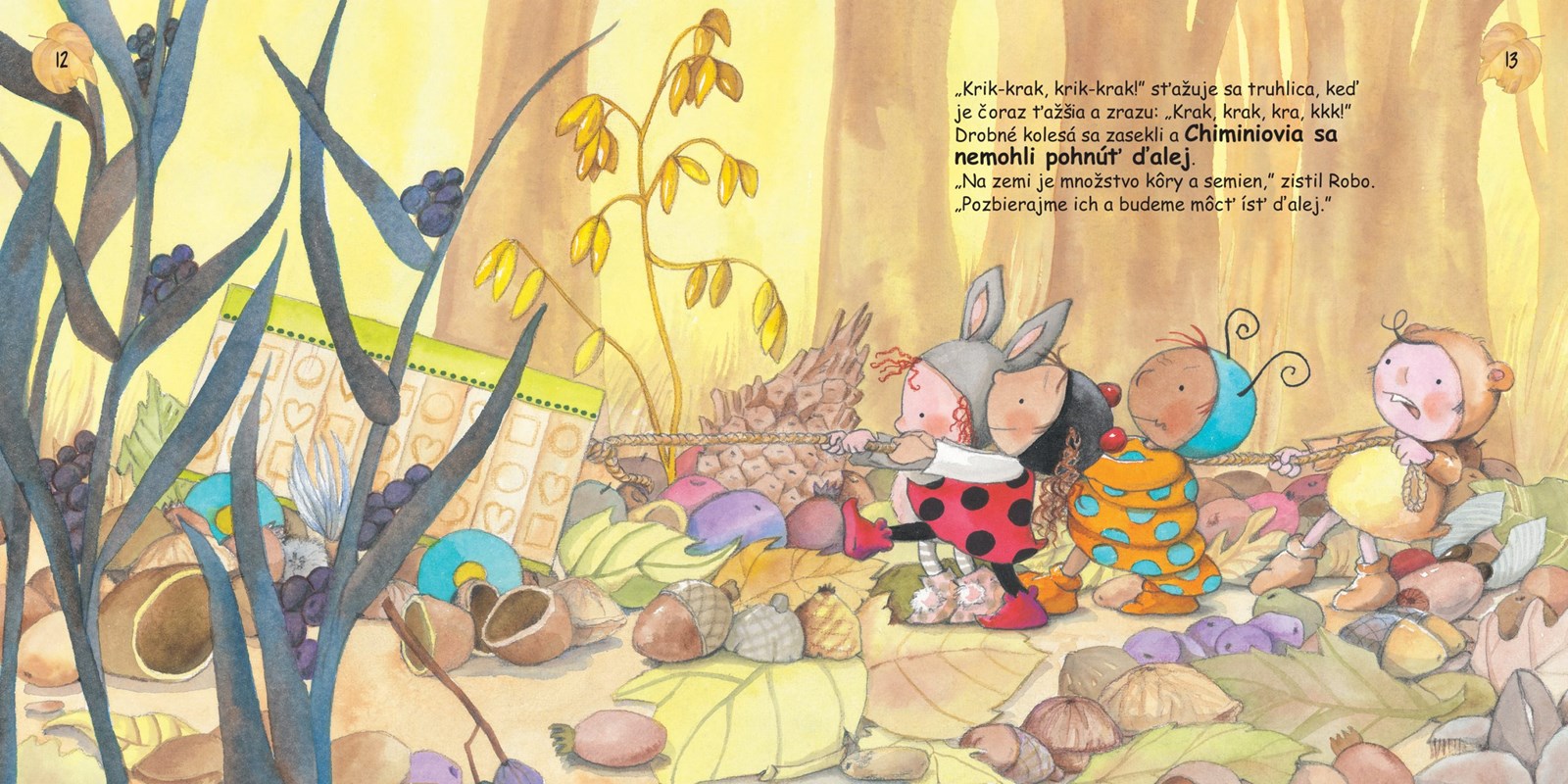 Ak by ste hľadali Chiminiov, prezradím vám: sú drobní ako píniové oriešky. Ak chcú byť vyšší, postavia sa na hríby. Aj keď sneží alebo prší, vzduchom sa nesie ich spev. Hrávajú sa medzi listami, ale pred nami ľuďmi sa ukrývajú!