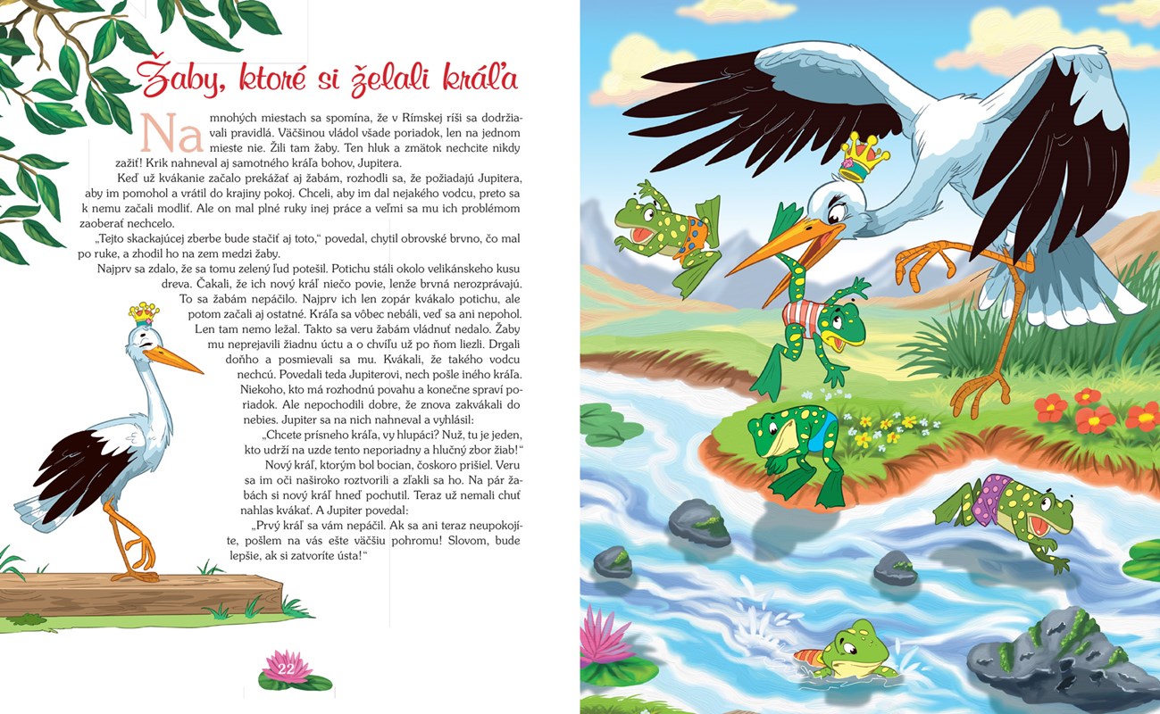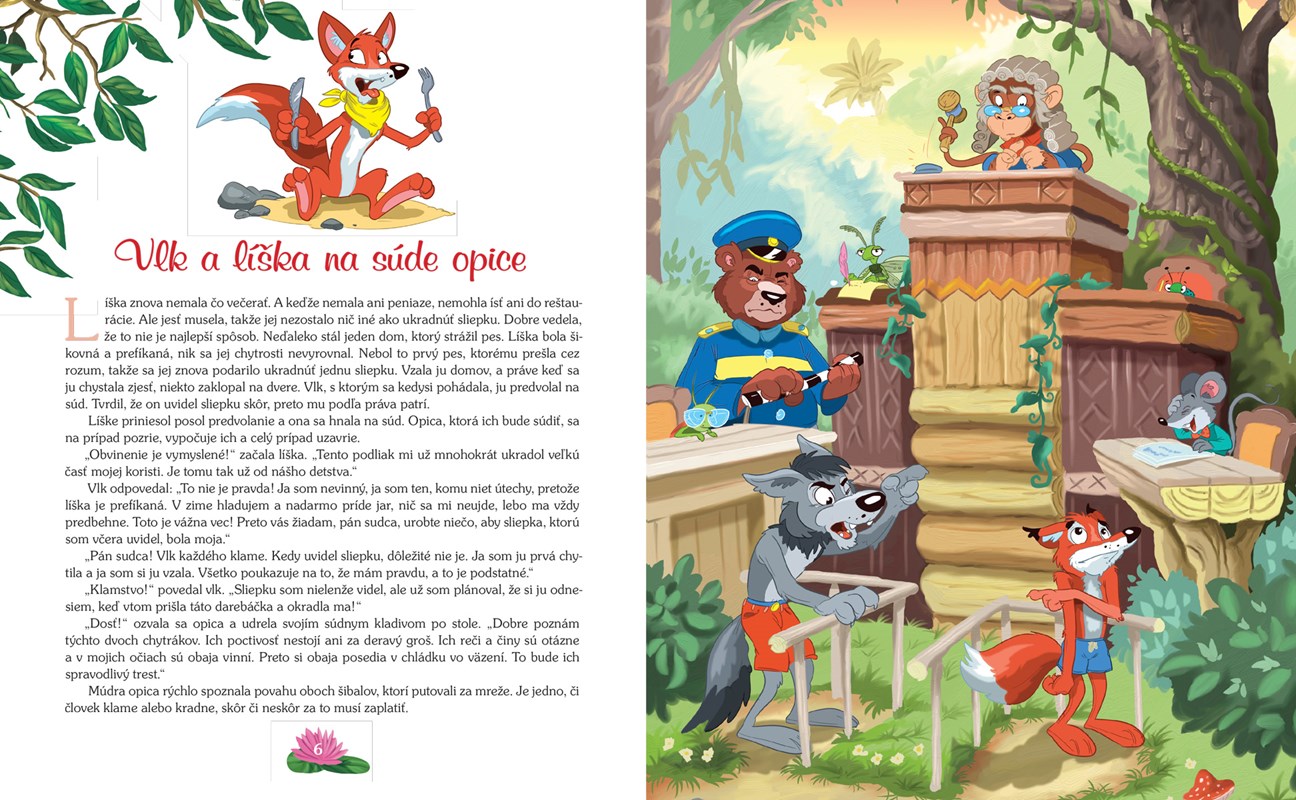 Popri známych bájkach ako Mlynár, jeho syn a somár, Havran a líška či Lev a myš sa v nej taktiež môžete dočítať o myšiach a ich sneme a dozviete sa, aký trest čakal na vlka a líšku na súde opice.