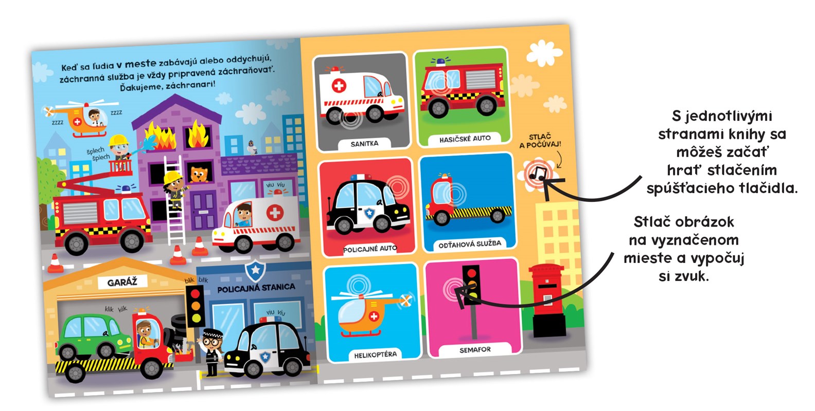 Táto farebná zvuková kniha predstavuje rôzne vozidlá. Deti sa hravou a zábavnou formou učia o rôznych druhoch vozidiel a stláčaním obrázkov sa zabávajú počúvaním zvukov áut. Jednotlivé strany si aktivuj stlačením spúšťacieho tlačidla. Potom už iba stláčaj obrázok na vyznačenom mieste a vypočuj si zvuk.
