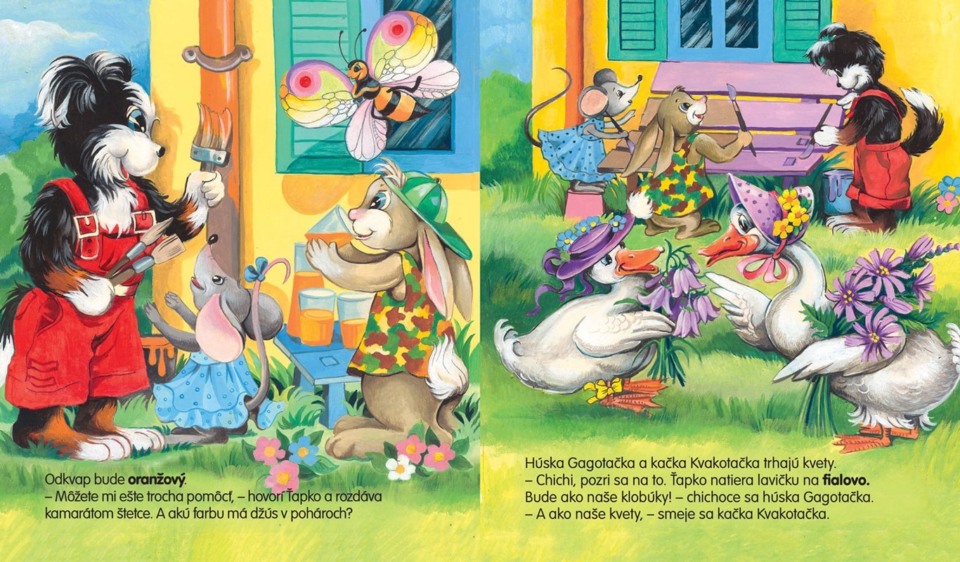 Psík Ťapko je šikovný psík a zaujíma sa o svet okolo seba. Pri oprave svojho domčeka sa naučil poznávať farby. Skús aj ty pomenovať farby vo svojom okolí.