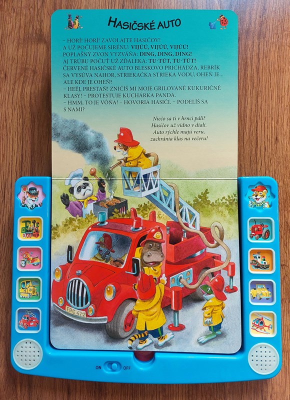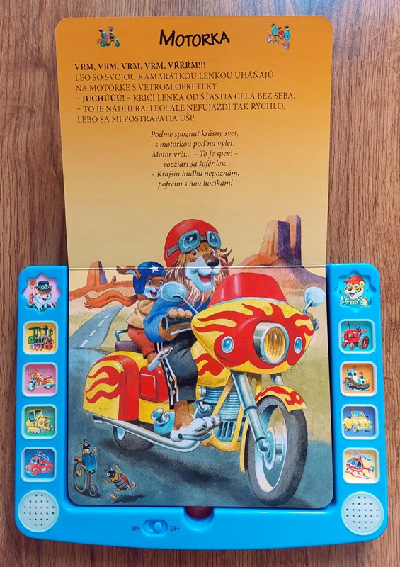 Čo to trúbi, čo to vrčí? Prichádza k Vám nový zábavný tablet so zvukmi s ilustráciami od Tony Wolfa! Auto vyráža na cestu, bager hĺbi diery, helikoptéra letí na pomoc... Započúvaj sa do zvuku ich motorov! Prečítaj si o nich krátke príbehy a stlač čarovné tlačidlá, ktoré ti prezradila, aké zvuky vydávajú! Vypočujte si spolu s Vašimi deťmi až osem zvukov dopravných prostriedkov (vlak, motorka, bager, hasičské auto, traktor, loď, auto, helikoptéra). Zvuky sa spustia stisnutím tlačidla. Ak ich chcete vypnúť, stisnite tlačidlo ešte raz. Výhodou tejto zvukovej knižky je gombík umiestnený naboku, ktorým môžete jednoducho knižku vypnúť a ušetríte tak výdrž batérie.