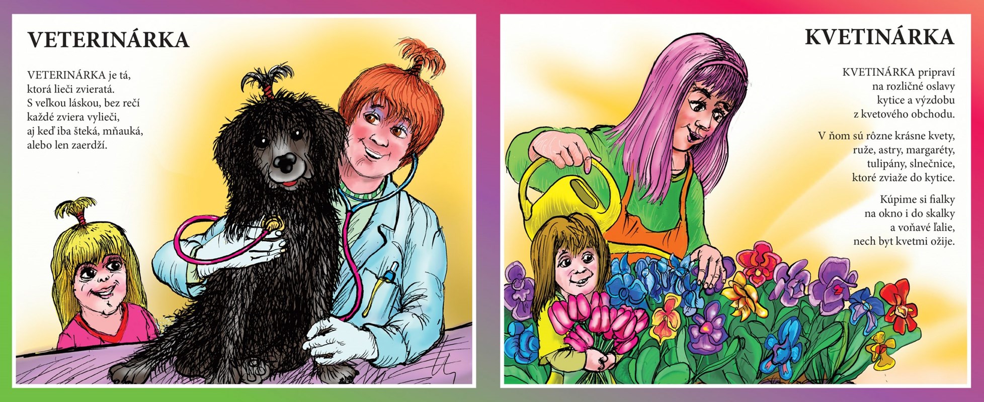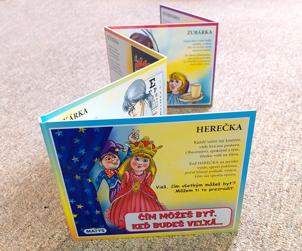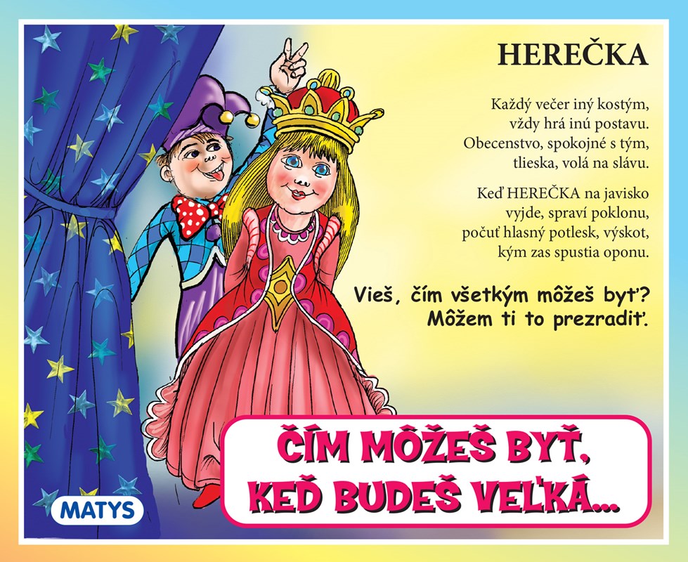 Veselé rozkladacie leporelo s podnadpisom: ,,Vieš, čím všetkým môžeš byť? Môžem ti to prezradiť.“ prináša desať krátkych roztomilých básničiek o najobľúbenejších dievčenských povolaniach - kaderníčka, lekárka, krajčírka, zubárka, kuchárka, veterinárka, kvetinárka, učiteľka, zdravotná sestrička a herečka. Malé zvedavé dievčatká sa vďaka milým rýmujúcim sa veršíkom, ľahkým na zapamätanie, zoznámia s rôznymi prácami, medzi ktorými určite nájdu tú, ktorá sa im najviac zapáči.