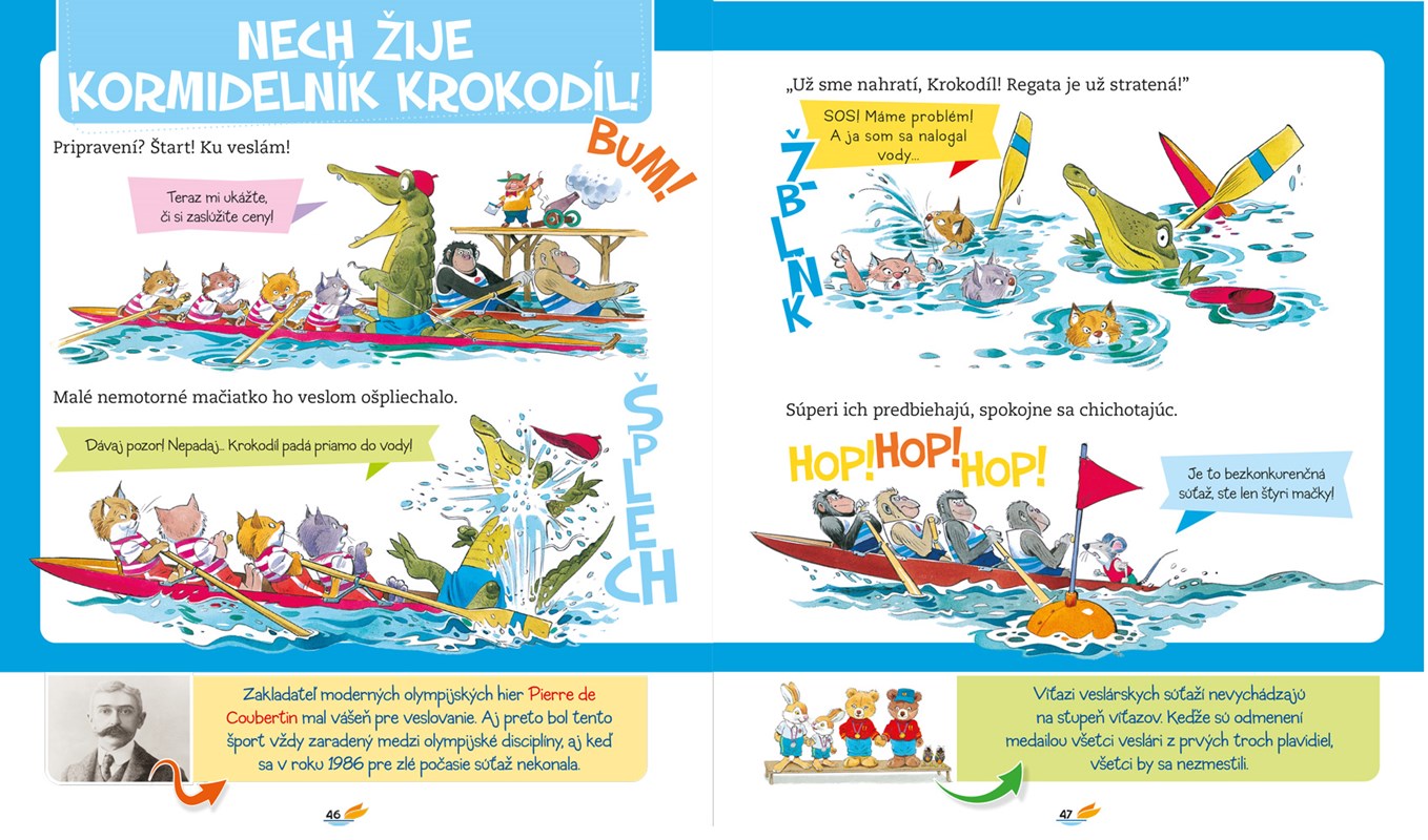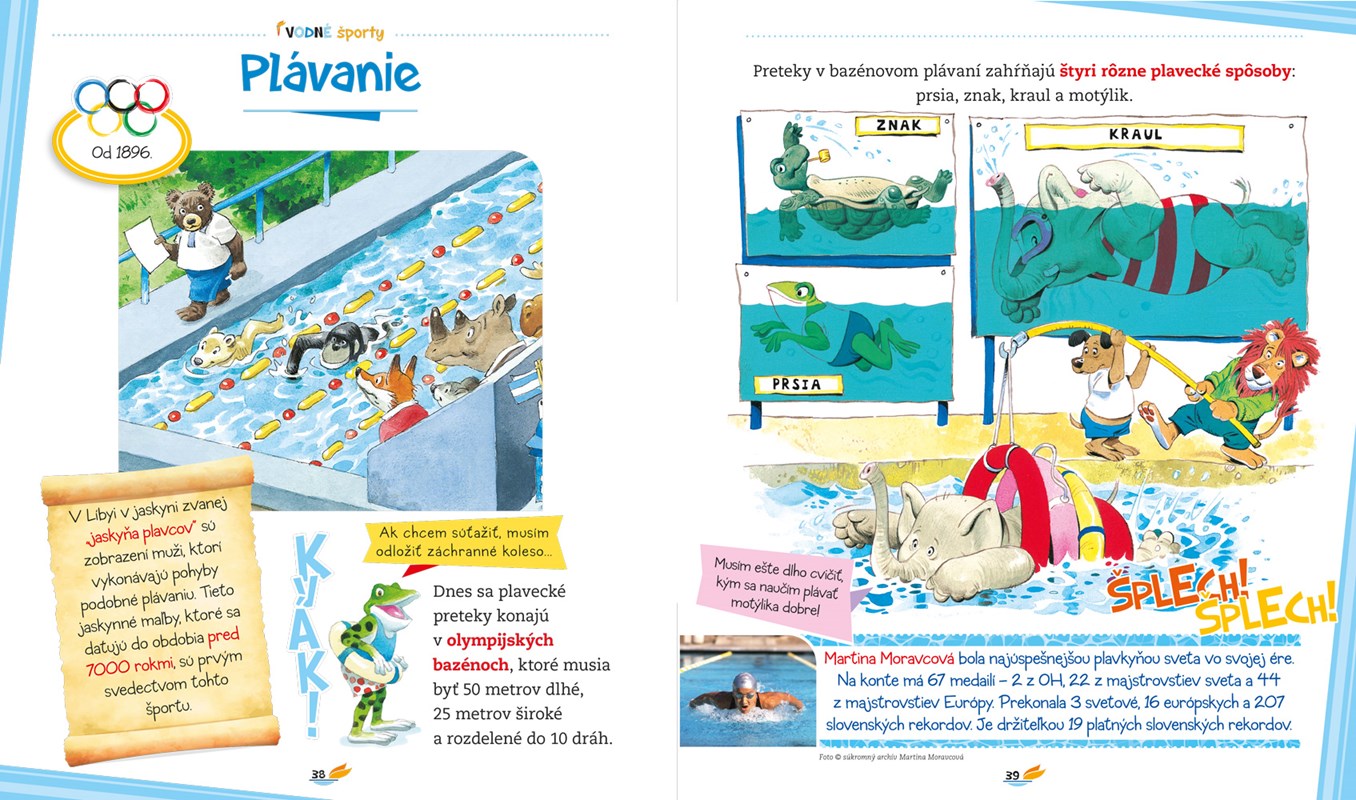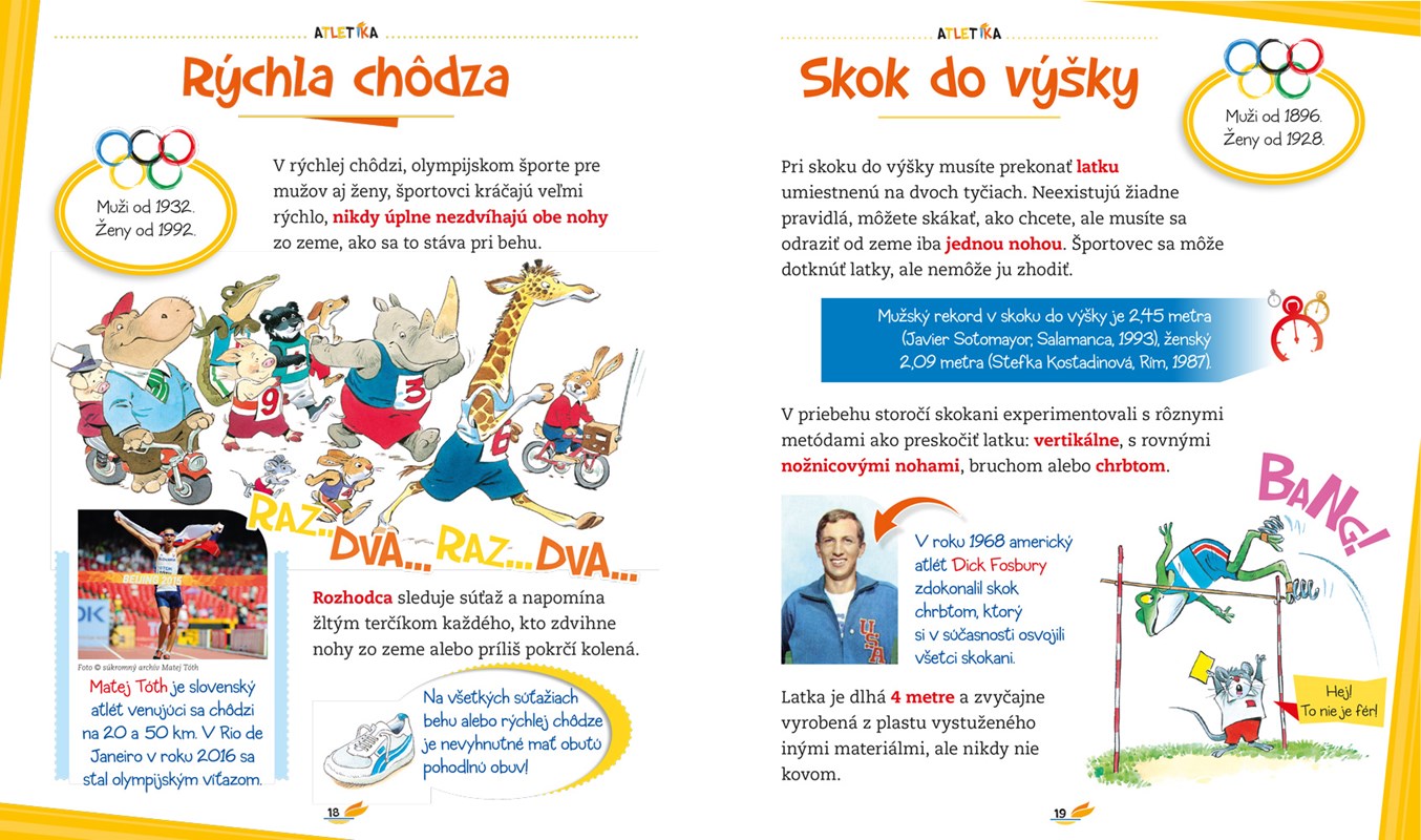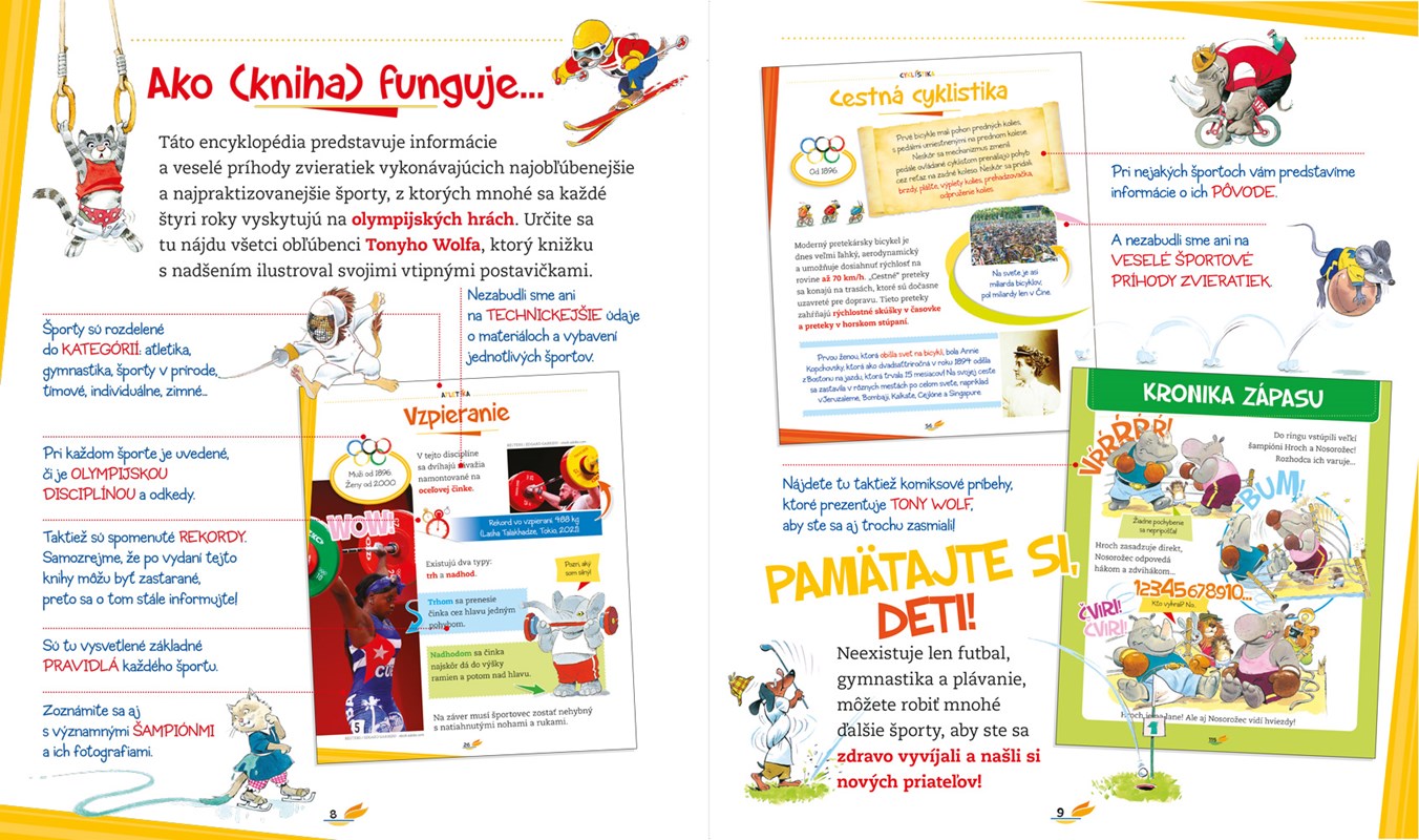 Naučme deti, že neexistuje len futbal, gymnastika či plávanie, ale môžu robiť aj mnohé ďalšie krásne športy! Táto encyklopédia zaujímavou formou približuje rôzne športy praktizované v interiéri, pod holým nebom, v lete či v zime, pre zábavu alebo kvôli meraniu si sily so súperom. Prináša základné fakty o danom športe - ako vznikol, v čom spočíva cieľ hry a aké sú hlavné pravidlá. Bonusom sú poznatky o rekordoch a fotografie svetových i slovenských športovcov. Čerešničkou na torte sú nezameniteľné ilustrácie Tonyho Wolfa. Do edukatívnej knižky vložil veselými obrázkami humor a nadsádzku. Komiksové príbehy lahodia nielen očiam, ale určite budú priaznivo vplývať na deti, ktoré sa na nich výdatne, tráviac zistené fakty, výdatne nasmejú.