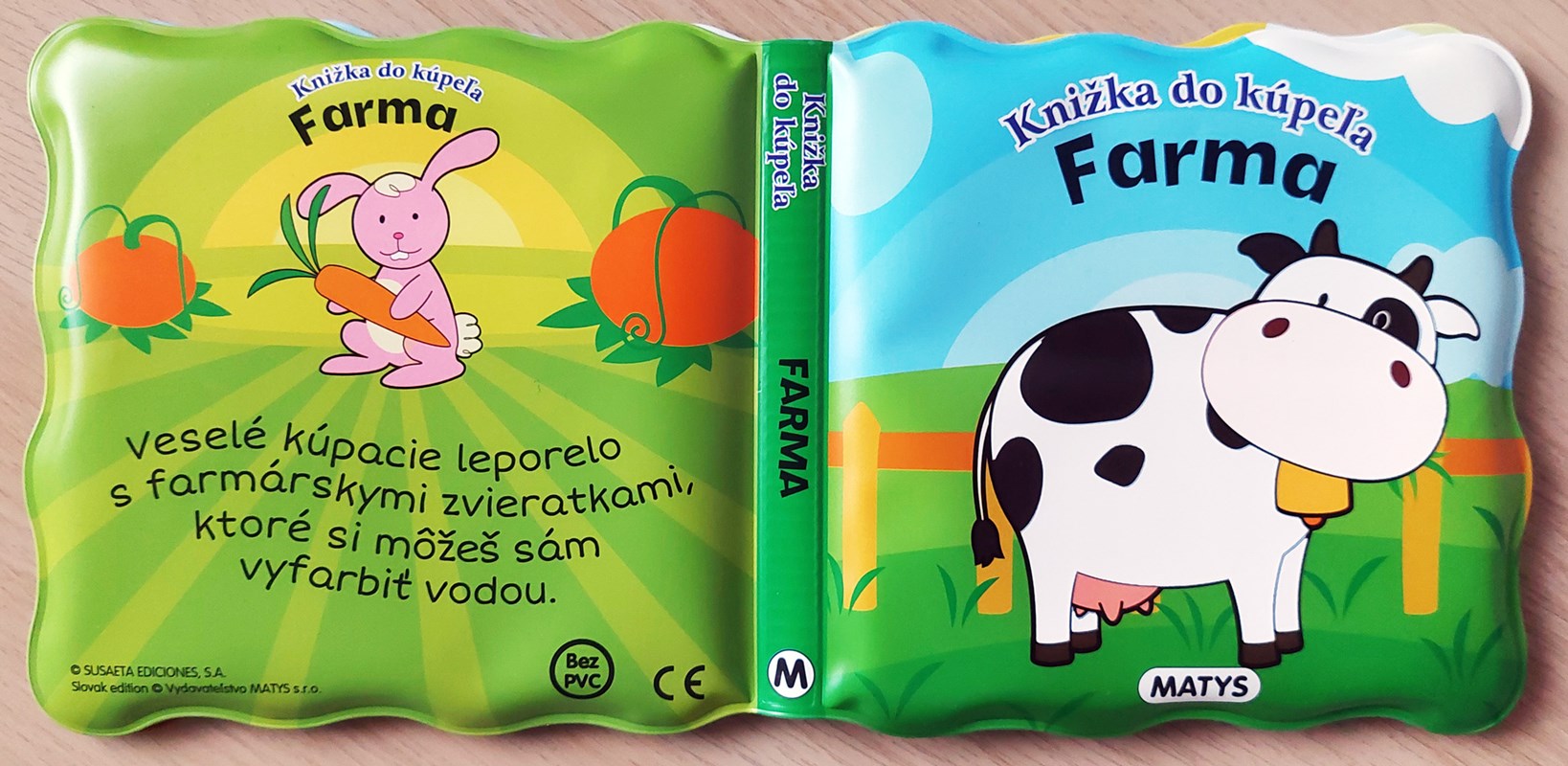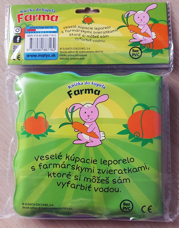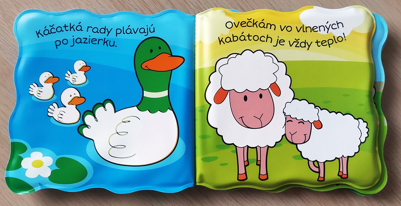 Séria Knižka do kúpeľa prináša deťom zábavu z vyfarbovania zvieratiek vodou! Krokom ku spríjemneniu chvíľ deťom počas kúpania je možnosť zabaviť ich leporelom. Nie však hocijakým, ale takým, ktoré sa rozžiari farbami po styku s vodou alebo so slinami. Alebo stačí pohár s vodou a drobné pršteky môžu kúzliť vodou priamo prechádzaním stranu po strane. O svojich drobcov sa nemusíte báť, pretože dané knižočky majú EÚ certifikát o zdravotnej neškodnosti. Môžu knihu močiť vo vode i olizovať, dokonca aj vtedy na nich spod obrázka vykukne farebné zvieratko. Veselé kúpacie leporelo s farmárskymi zvieratkami, ktoré si môžu vyfarbiť vodou (kačičky, ovečky, osol, sliepočka, prasiatko, kôň).