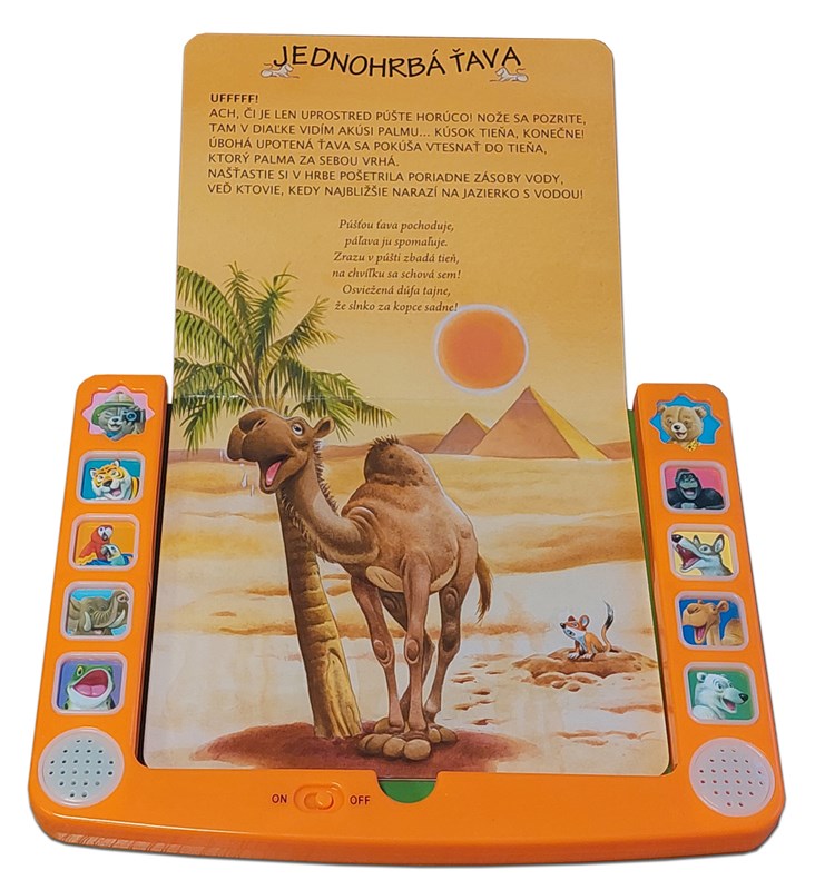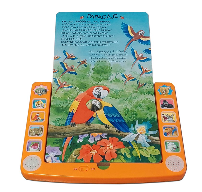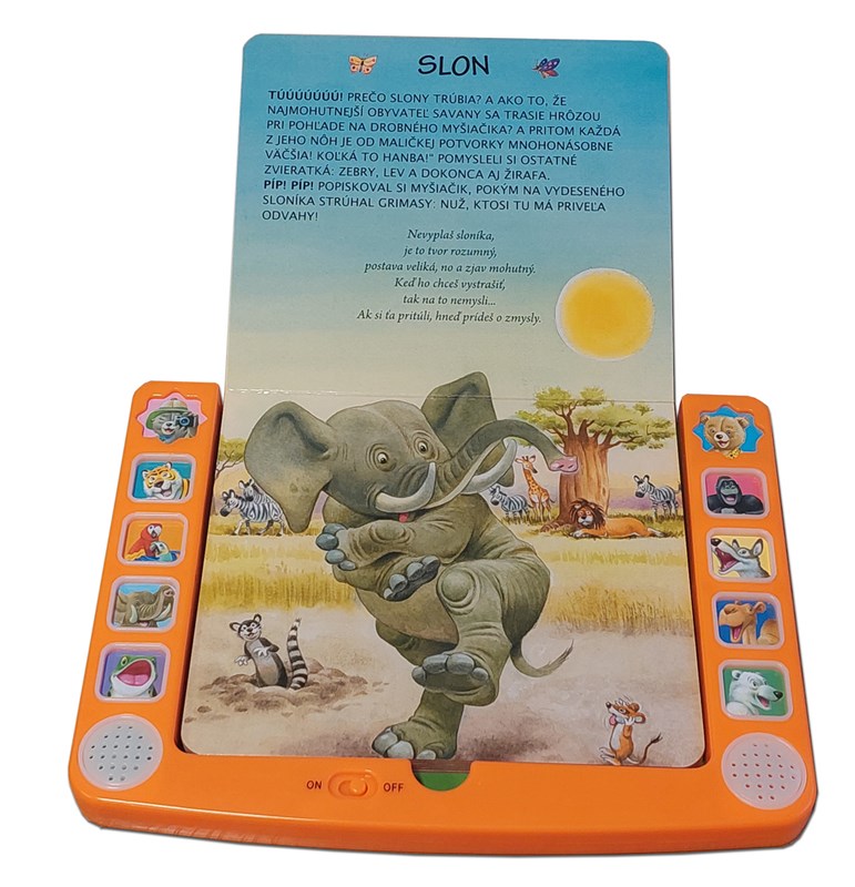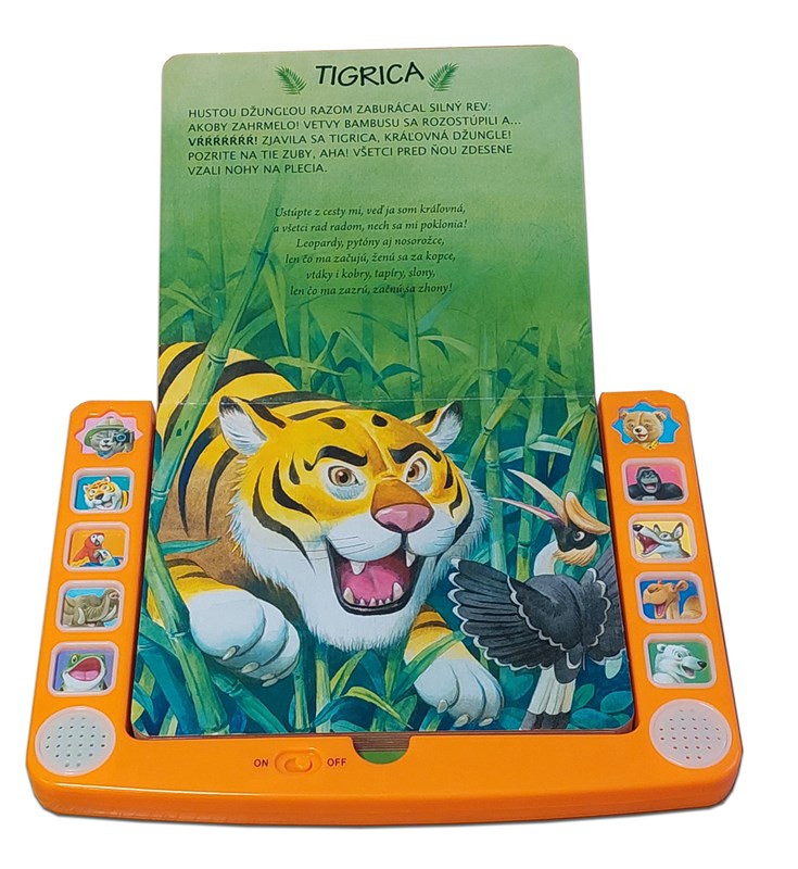V lese, na savane aj na púšti žijú milé a zaujímavé zvieratká, ktorých zvuk si môžu detičky vypočuť stlačením príslušného tlačidla. Tento nový detský tablet prináša až 10 zvukov. Kniha obsahuje krátke textíky a básničky o tigrici, papagájoch, slonovi, žabkách, gorile, vlkovi, jednohrbej ťave i o medveďovi bielom. Knižka má poistku vzadu i vpredu, vďaka čomu sa predĺži výdrž batérie. O ilustrácie sa postaral Tony Wolf. Kniha rozvíja predstavivosť, zmyslové i poznávacie schopnosti.