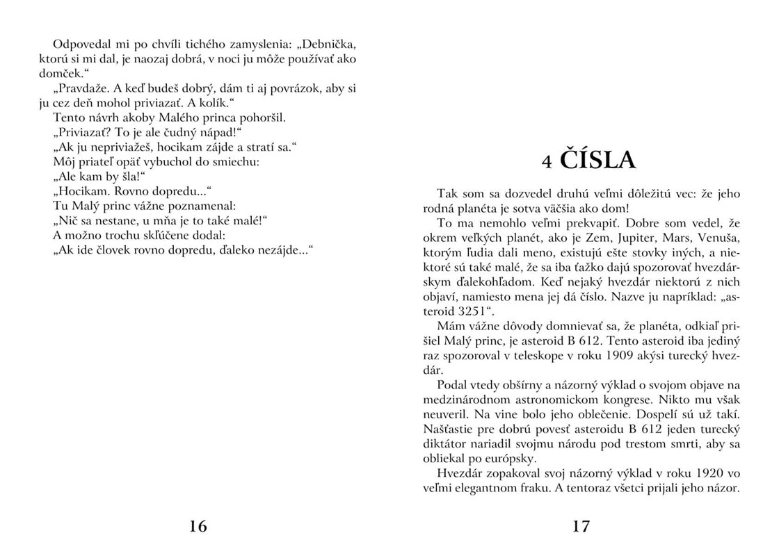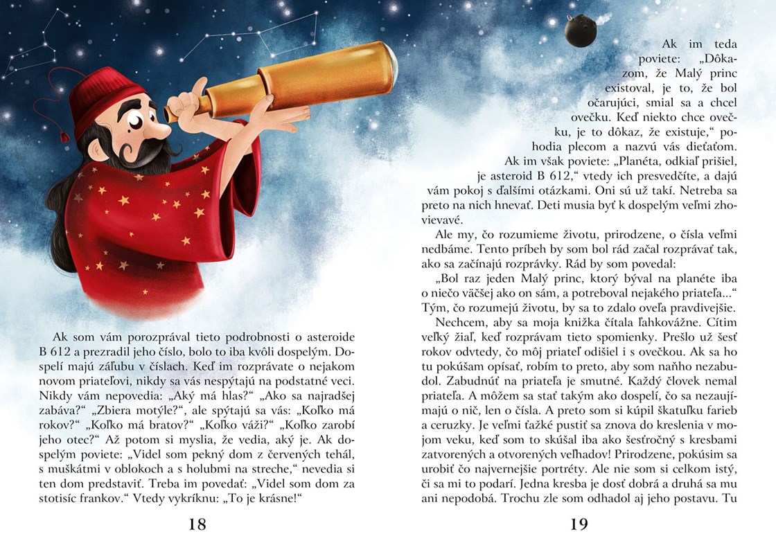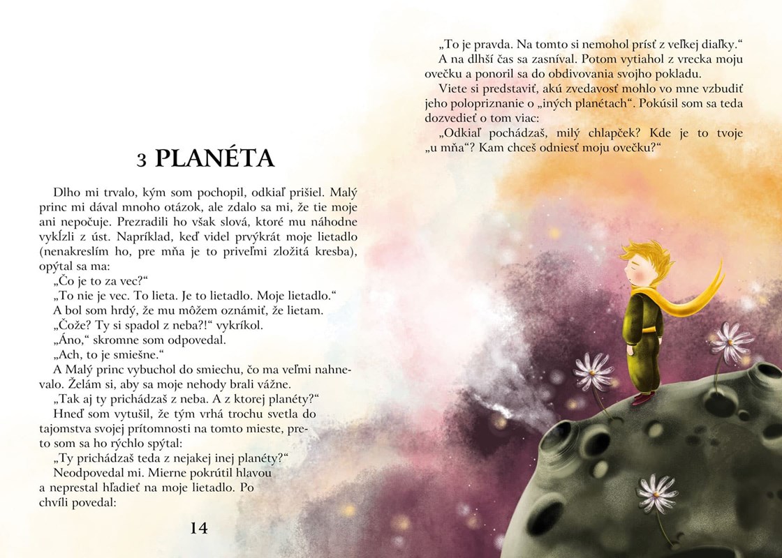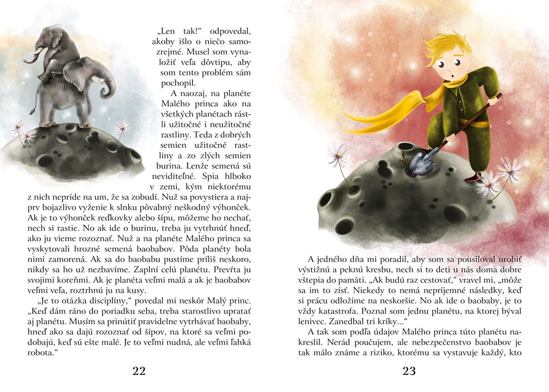 Kto by nepoznal Malého princa? Tento rozsahovo síce krátky, ale posolstvom hlboký príbeh o Malom princovi z asteroidu B 612, ktorý cestuje po vesmíre a navštevuje podobné planétky a ich obyvateľov, určite netreba nikomu predstavovať. Najznámejšie dielo plné silných a nadčasových myšlienok od francúzskeho spisovateľa a pilota Antoineho de Saint-Exupéryho prinášame s očarujúcimi kresbami od slovenskej ilustrátorky Michaely Šefrankovej, ktorá tak známemu príbehu vdýchla niečo nové, jemné, dojímavé a krásne.