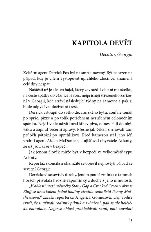 Do pátrání se rozhodne zapojit i zvláštní agent Derrick Fox. Jeho mladší sestra Kim zmizela ve stejné oblasti před dvaceti pěti lety – právě v den, kdy ji měl hlídat. Derrick je přesvědčený, že případy spolu souvisejí a že za poslední více než dvě dekády se v této oblasti ztratil téměř tucet dívek. Ellie odmítá uvěřit, že by v jejich těsně semknuté horské komunitě mohl žít nebezpečný šílenec, ale ani ona nemůže popřít podobnosti mezi případy. A když objeví ostatky malého těla pohřbeného s vyřezávanou dřevěnou panenkou, je jasné, že čelí smrtícímu sériovému vrahovi, který si za oběti vybírá nevinné malé dívky.