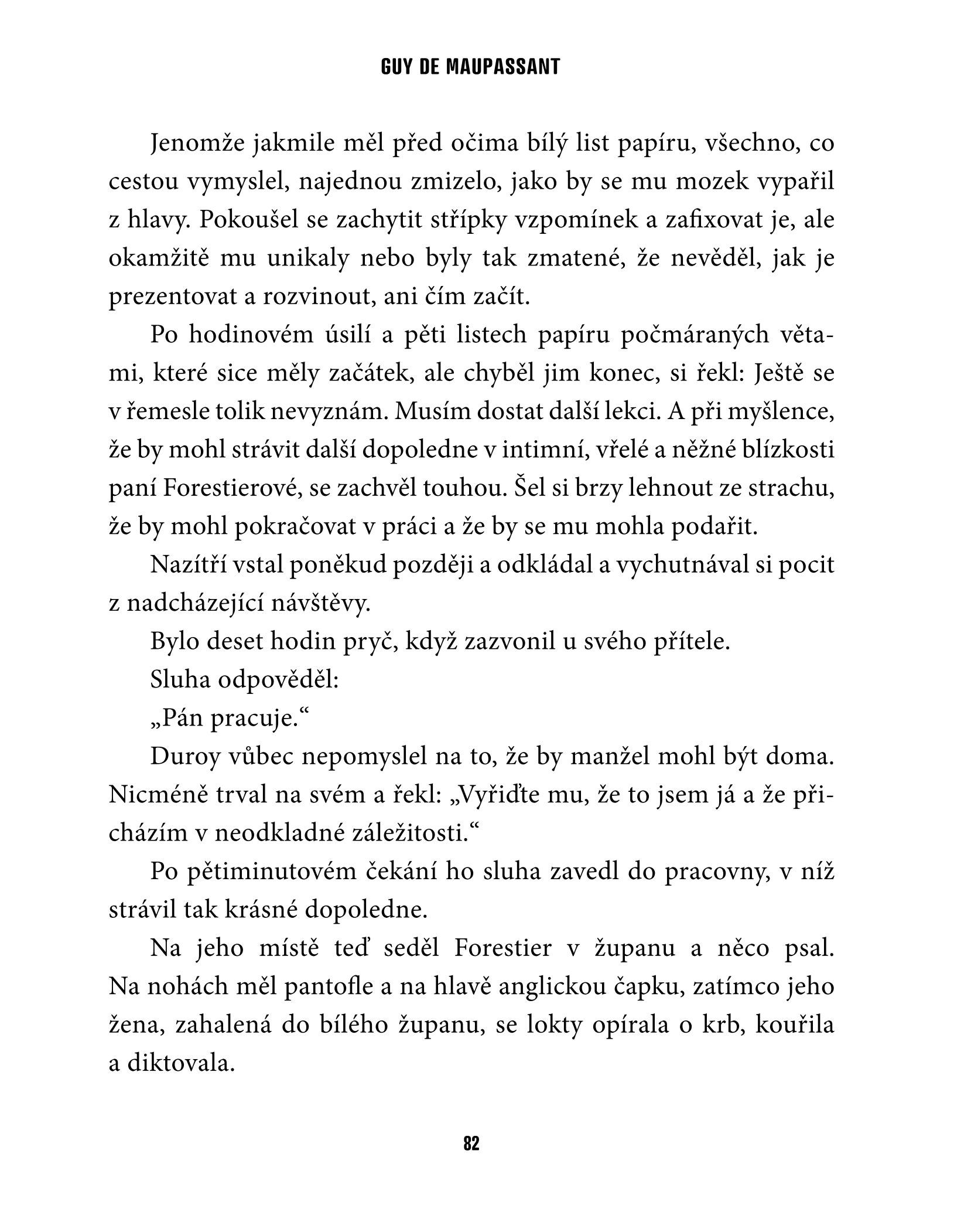 Román Miláček nás přenáší do Paříže na konci 19. století, kde se ctižádostivý sukničkář George Duroy nachází ve velmi špatné finanční situaci a hledá práci. Neváhá přitom využít své přitažlivosti pro něžné pohlaví, nevadí mu prožívat několik paralelních vztahů zároveň a neštítí se udělat cokoliv, co ho přiblíží jeho snu mít moc a peníze.