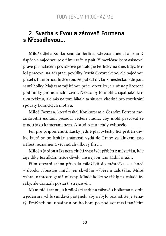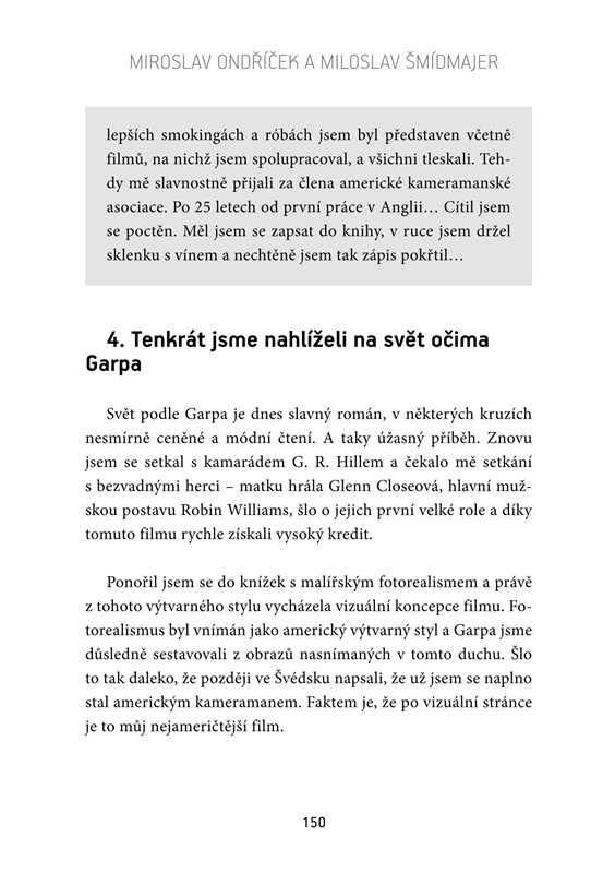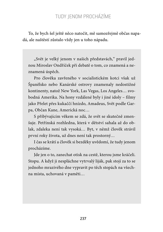 „Svět je velký jenom v našich představách,“ pravil jednou Miroslav Ondříček při debatě o tom, co znamená a neznamená úspěch.I čas se krátí a člověk si bezděky uvědomí, že tudy jenom procházíme. Jde jen o to, zanechat otisk na cestě, kterou jsme kráčeli. Stopu. A když ji nespláchne vytrvalý liják, pak stojí za to se jednoho mrazivého dne vypravit po těch stopách na všechna místa, uchovaná v paměti…