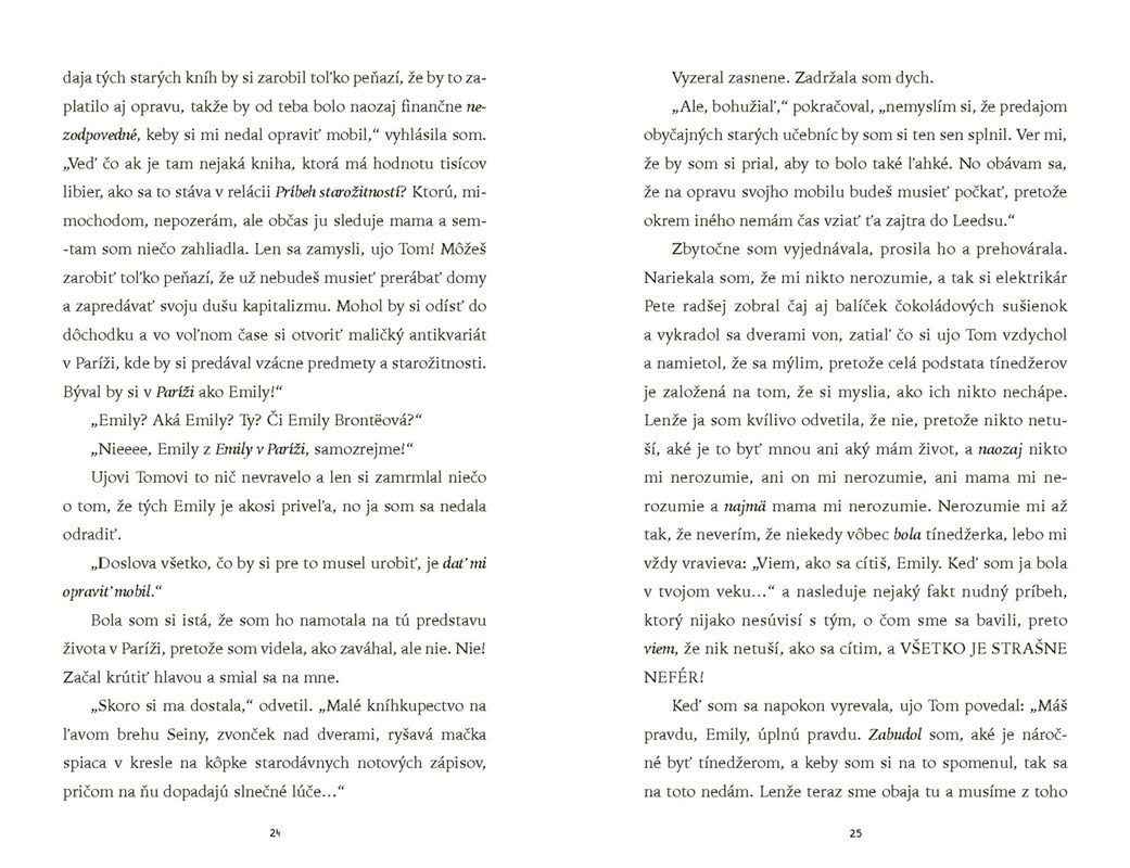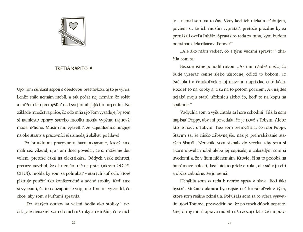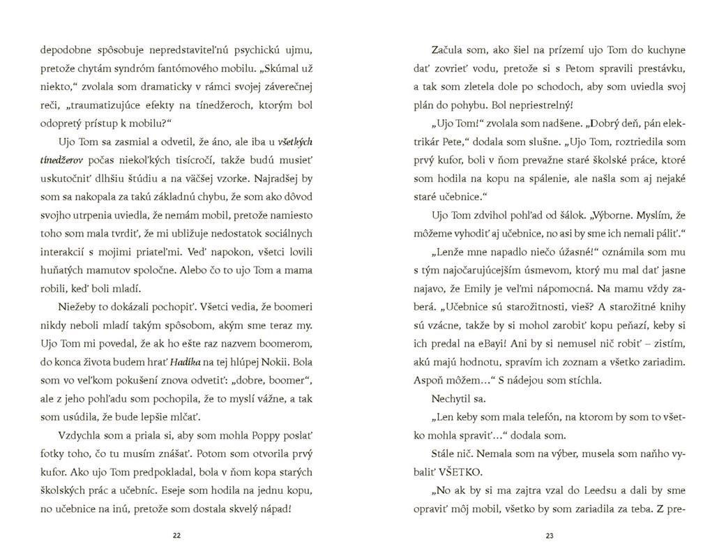 Štrnásťročná Emily má fakt veľkú smolu. Namiesto pohodových prázdnin, skrolovania na mobile a čakania, či ju konečne pozve na rande jej vysnívaný Toby, najkrajší chalan z ročníka, musí rekonštruovať dom s maminým najlepším kamošom ujom Tomom. A akoby toho utrpenia nebolo dosť, rozbila si mobil a iPad nechala u otca. Totálna katastrofa! Ako má prežiť prázdniny bez svojej najkamošky, technológií a najmä bez sociálnych sietí? Nikto z dospelákov, samozrejme, nechápe jej zúfalstvo, pretože nikdy neboli mladí!