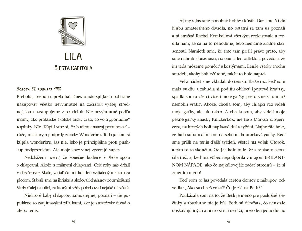 Potom však Emily objaví mamin starý denník. A keď ho začne čítať, ohromene zisťuje, že aj jej mama bola kedysi tínedžerkou. V deväťdesiatych rokoch, ére divnej módy, predpotopnej hudby a filmov, o ktorých Emily nikdy nepočula, žilo dievča menom Lila MacKayová, ktoré fakt nikto nechápal. A navyše, boli tam aj chalani! Napríklad roztomilý chalan z parku Tom či trápny sused Divný Nicky.