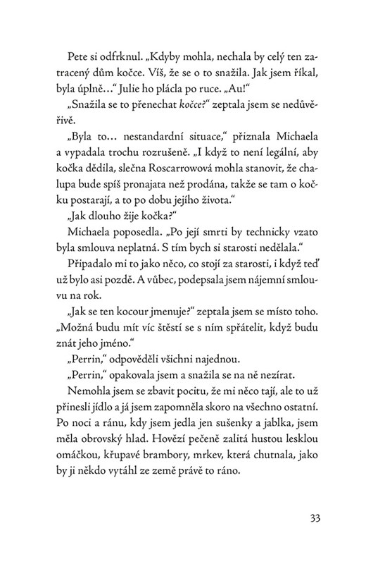 Jessamine utíká z Londýna do srdce Cornwallu, aby našla klid na psaní. Jenže stará chalupa, kterou si pronajme, skrývá mnoho tajemství – a také Perrina, záhadného kocoura s pronikavým pohledem. Jess brzy zjistí, že se ocitla uprostřed magického příběhu, který se odehrává už pět století. S rozplétáním minulosti jí pomáhají dva muži, každý k tomu ale má své důvody. Vánoce se blíží a Jess se pokouší rozluštit, proč ji k sobě dům přitáhl… Bude z něj vůbec někdy chtít odejít?