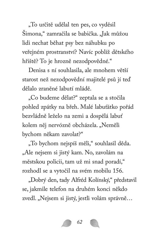 Babička s dědečkem vzali Denisu a Šimona na výlet do Prahy. Při zastávce na břehu Vltavy narazí na pokousané labutí mládě. Děda neváhá a zavolá na záchrannou stanici. Během pár minut je mláďátko v dobrých rukou. Jak se mu však povede dál? Najdou děti způsob, jak se to dozvědět, i když jsou návštěvy pro veřejnost ve stanici zakázané?