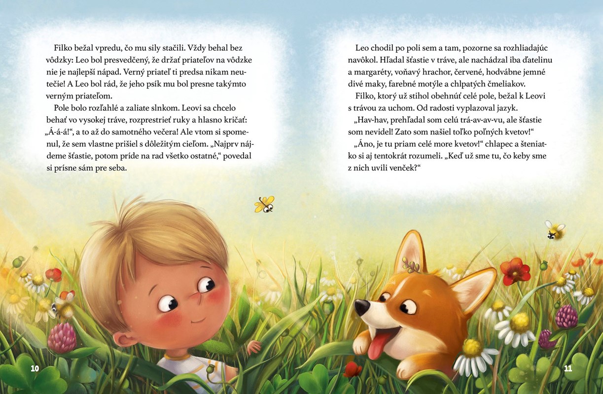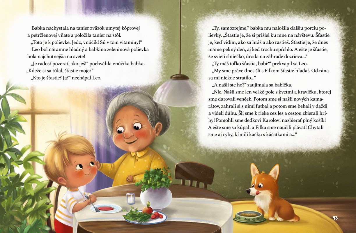 Leo sa spolu so svojím verným priateľom, šteniatkom Filkom, vydáva na nezabudnuteľnú cestu za hľadaním šťastia. Prechádzajúc sa cez pole s kvetmi kravičke darujú venček, zahrajú si s novými kamarátmi futbal, behajú po daždi a uvidia nádhernú dúhu. Cestou k rieke cez les sa im podarí nazbierať plný košík hríbov, chytajú ryby, kŕmia kačku s káčatkami, zaplávajú si a na obed ich čaká skvelá babkina zeleninová polievka a palacinky s jahodovým lekvárom. No nie je to šťastie?